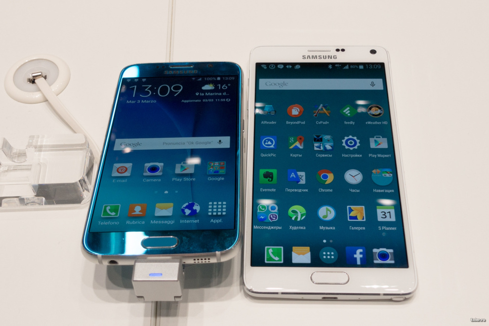 Вот S6 рядом с Note 4. Да, Note 4 выглядит более топорным по дизайну, S6 они заметно пригладили/скруглили. Но лучше бы они это не делали, на мой взгляд.