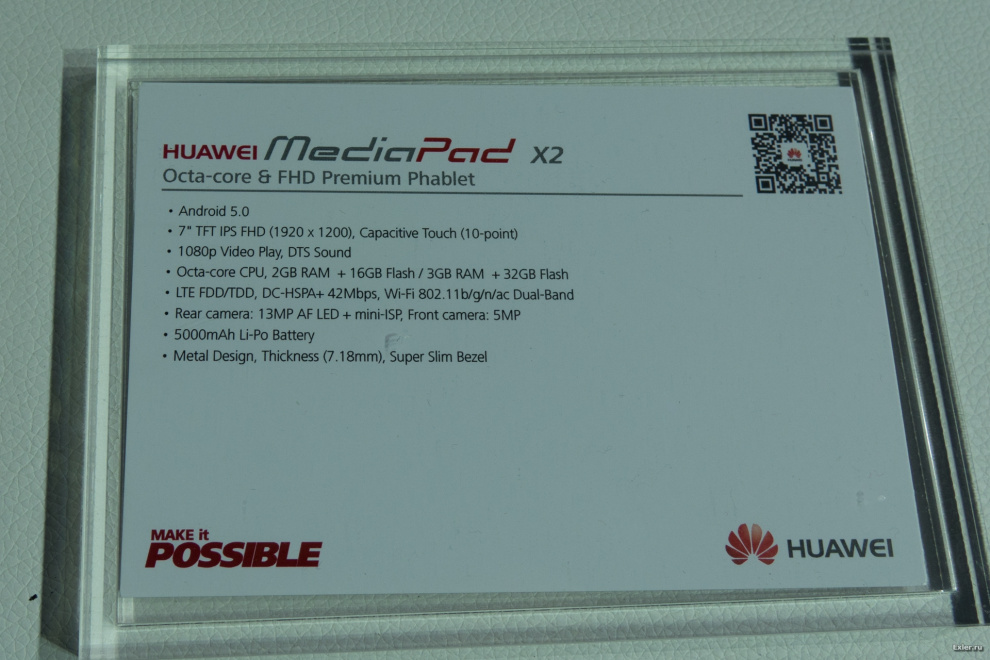 Еще одна интересная новинка (о ней не рассказывали на презентации) - семидюймовый планшет Huawei MediaPad X2. Вот его характеристики. С полной поддержкой мобильной связи до LTE, IPS-матрица с FullHD, 5000 мАч аккумулятор - выглядит более чем интересно.