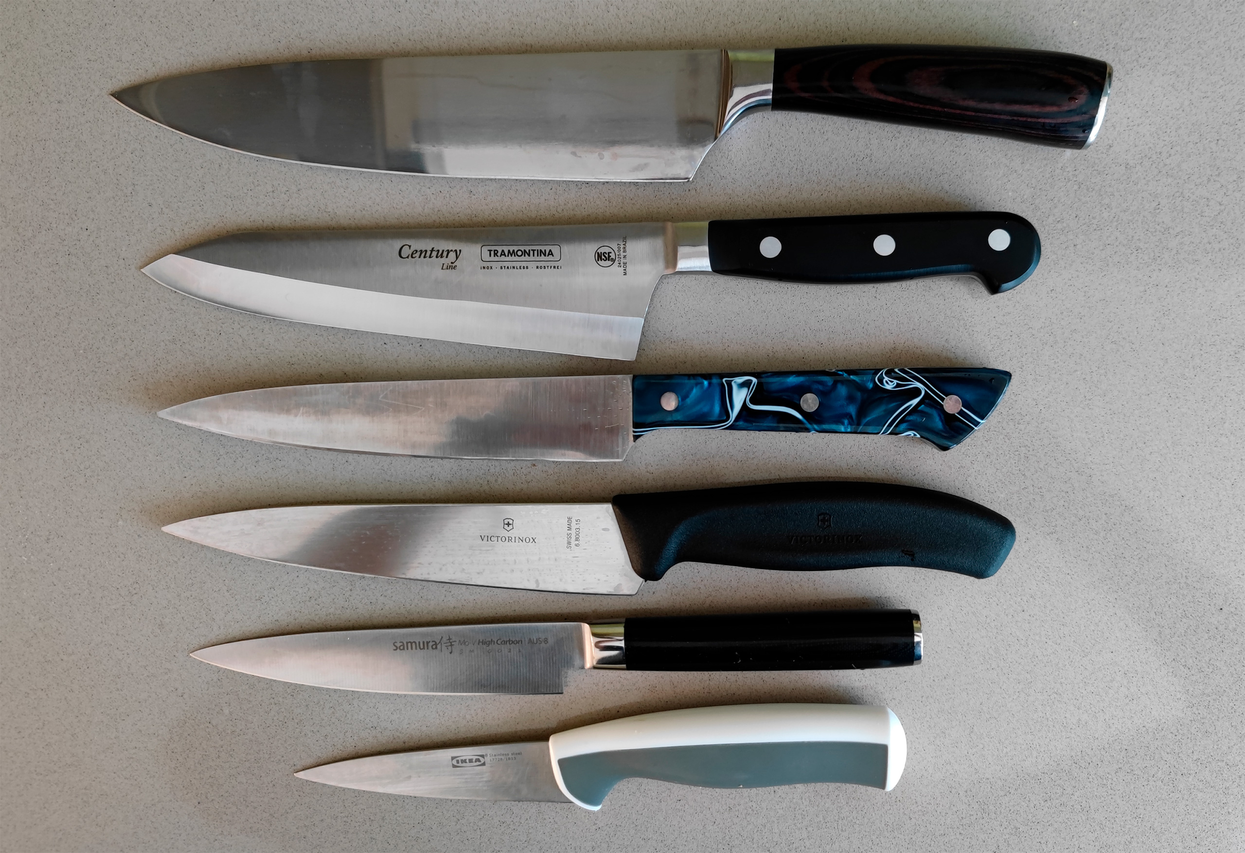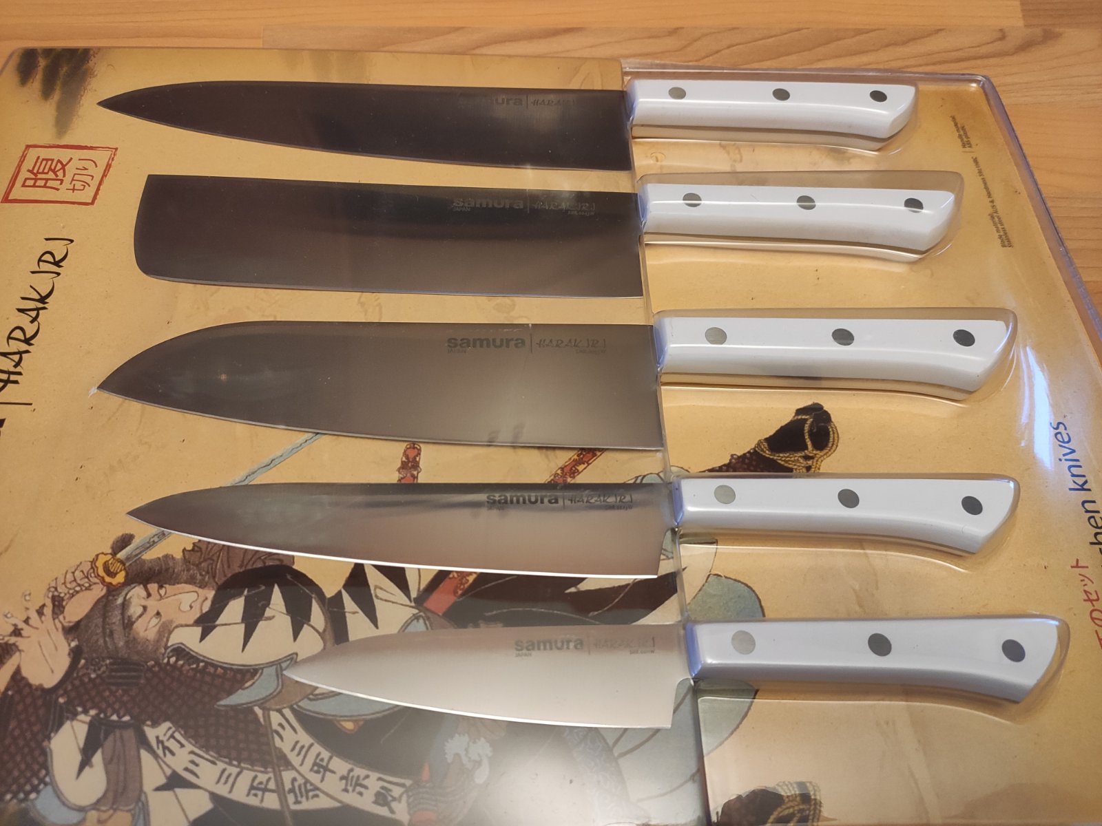 Далее идет 12,5-сантиметровый Samura MO-V, он хороший, но оказался наименее востребованным, используем его редко. (Вот 20.8-сантиметровый шеф-нож Samura Harakiri, который у меня есть, очень хорош, но я нашел вариант получше.)