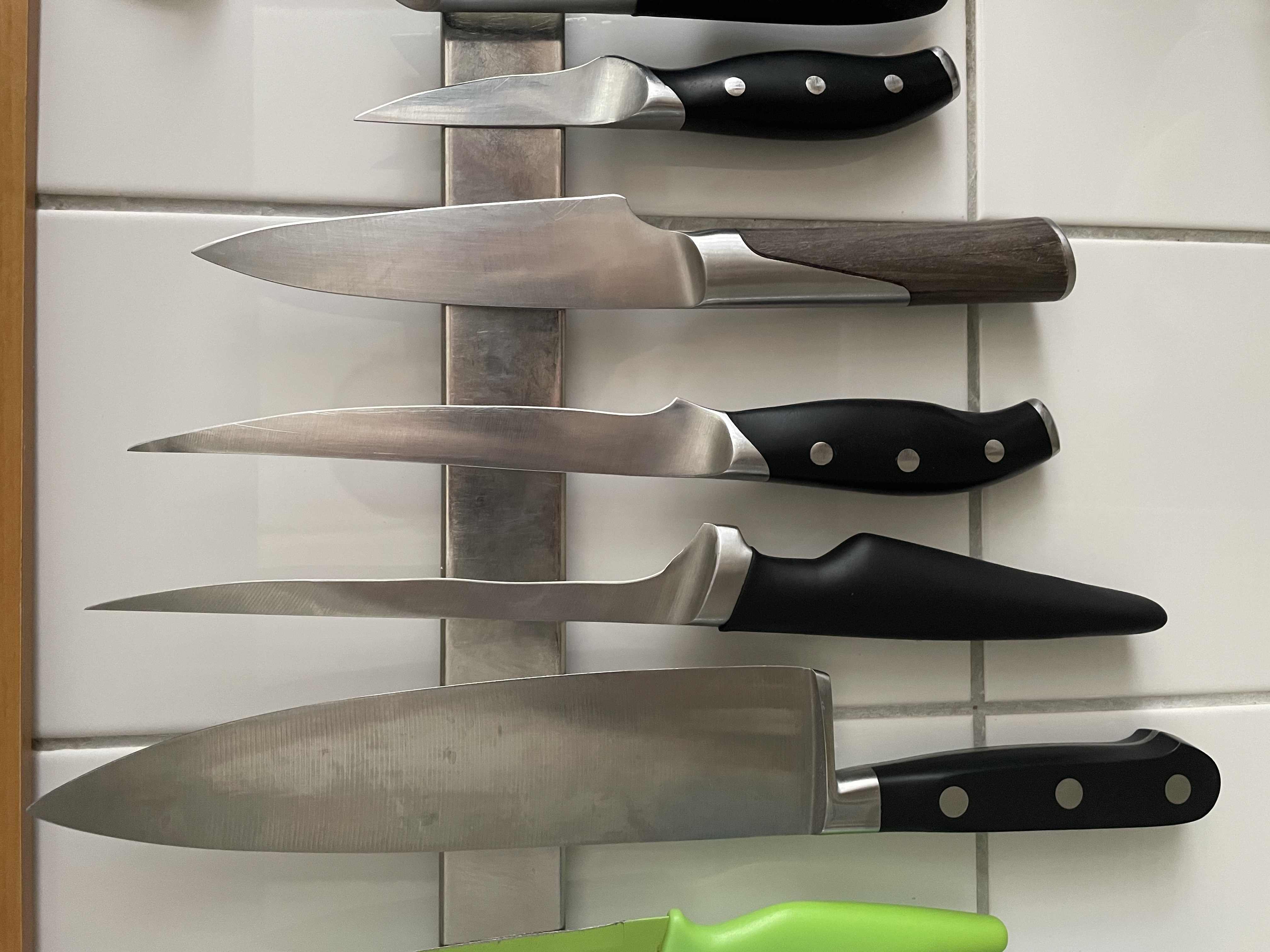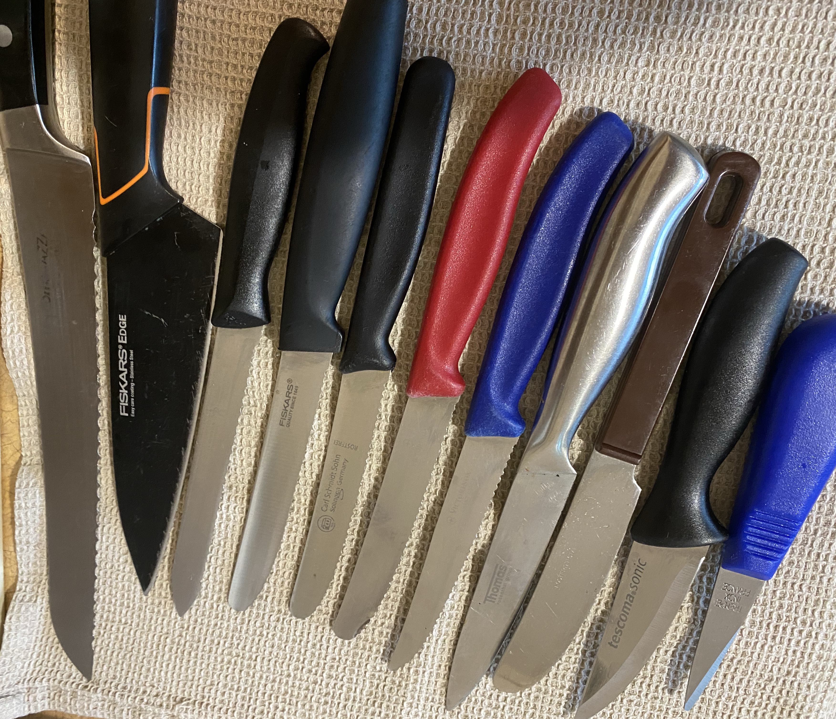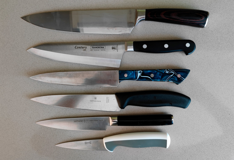 Снизу вверх. Самый маленький - икеевский фруктовый ножичек, оставшийся от большого набора. Кстати, набор был очень хороший: у меня было три разных икеевских набора ножей, все они были вполне достойные.