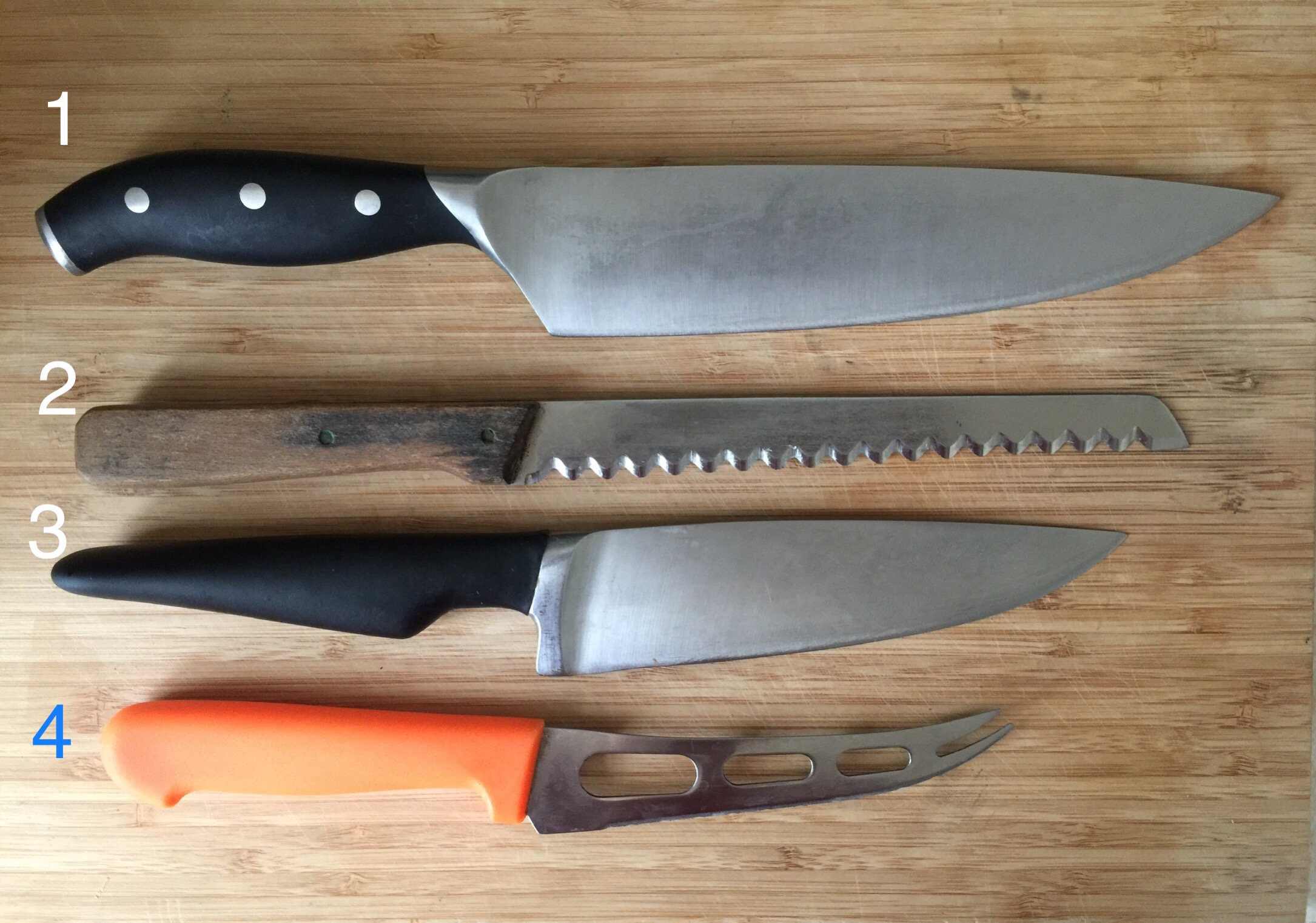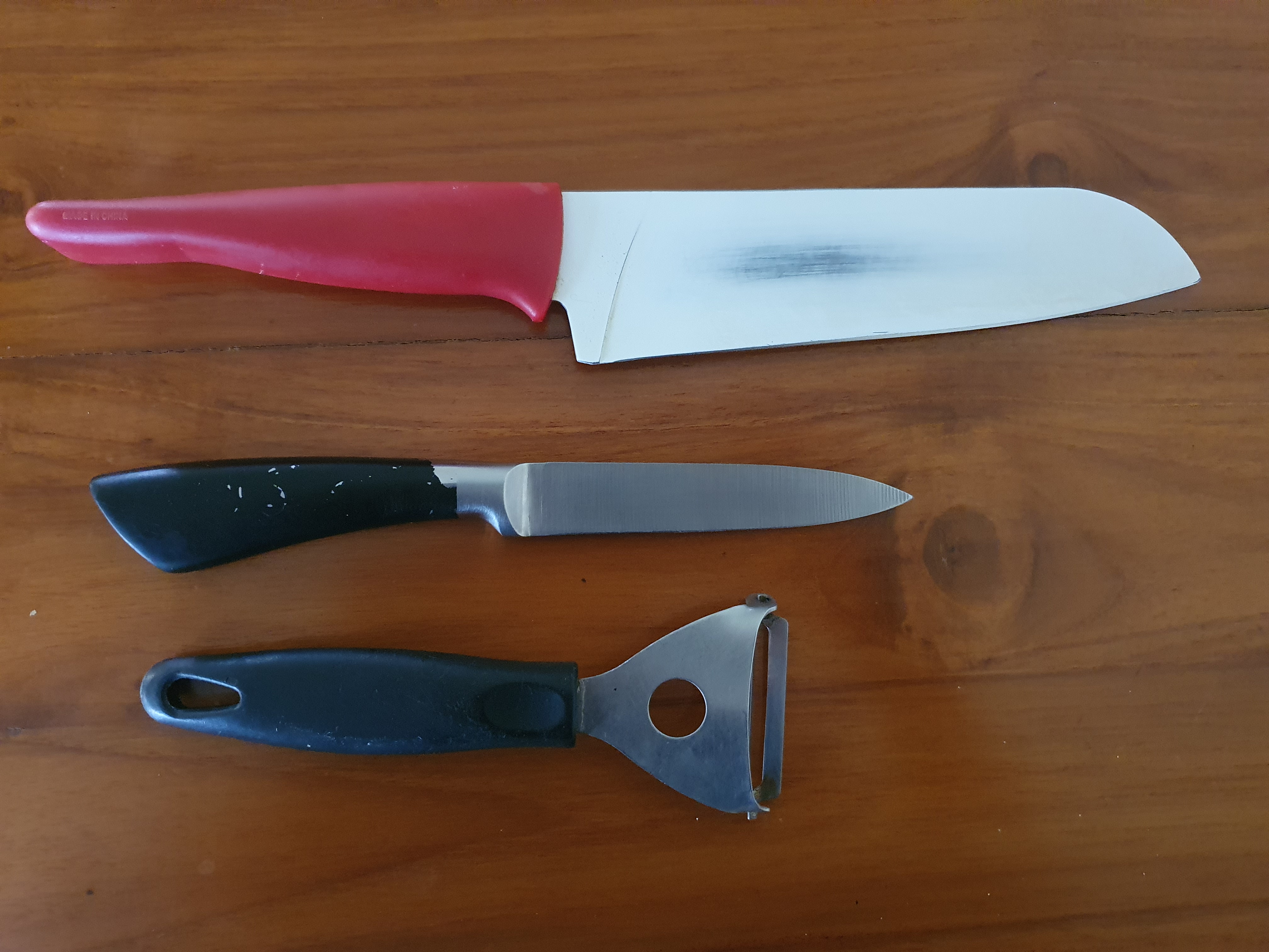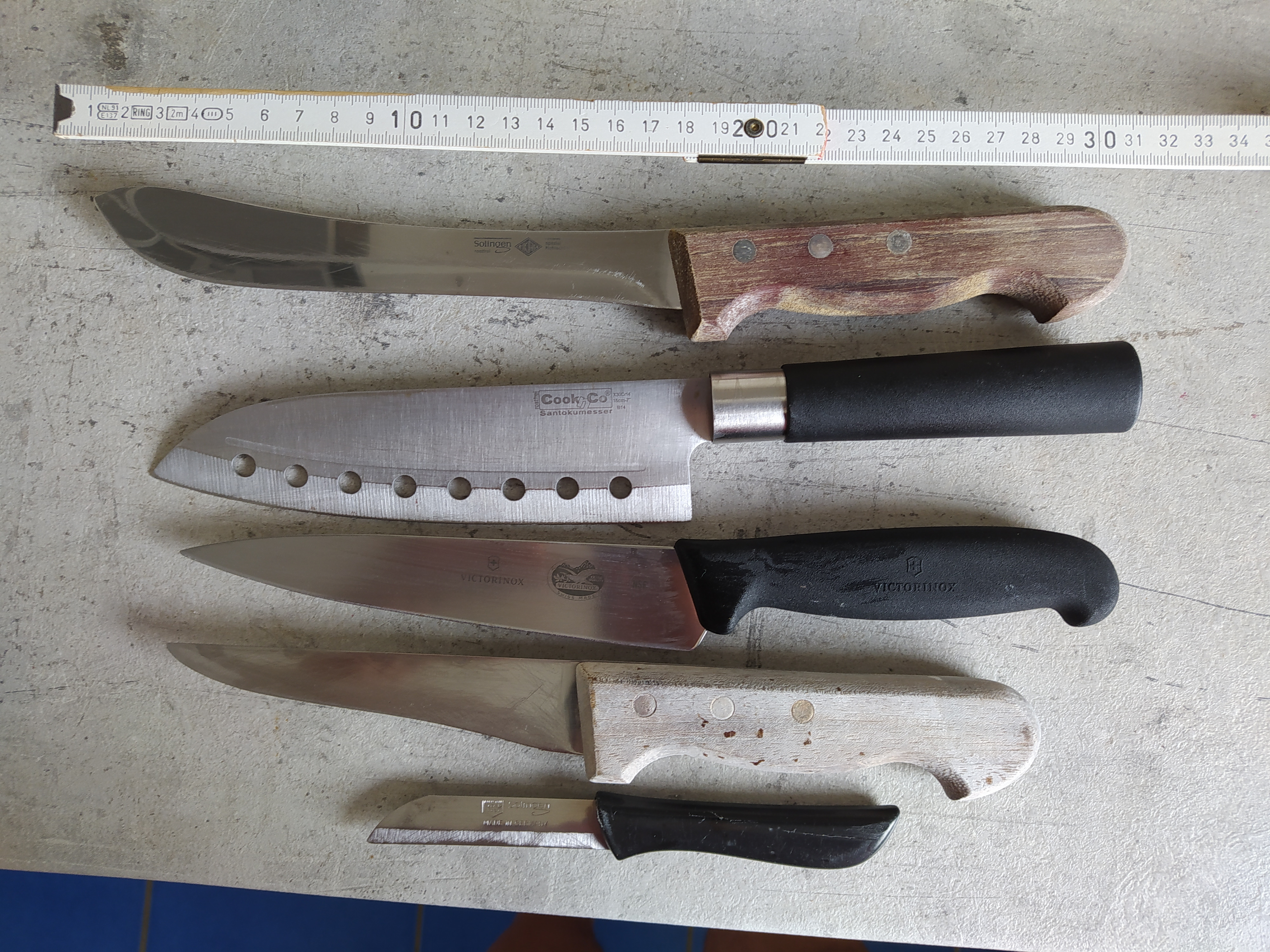 Снизу вверх. Самый маленький - икеевский фруктовый ножичек, оставшийся от большого набора. Кстати, набор был очень хороший: у меня было три разных икеевских набора ножей, все они были вполне достойные.