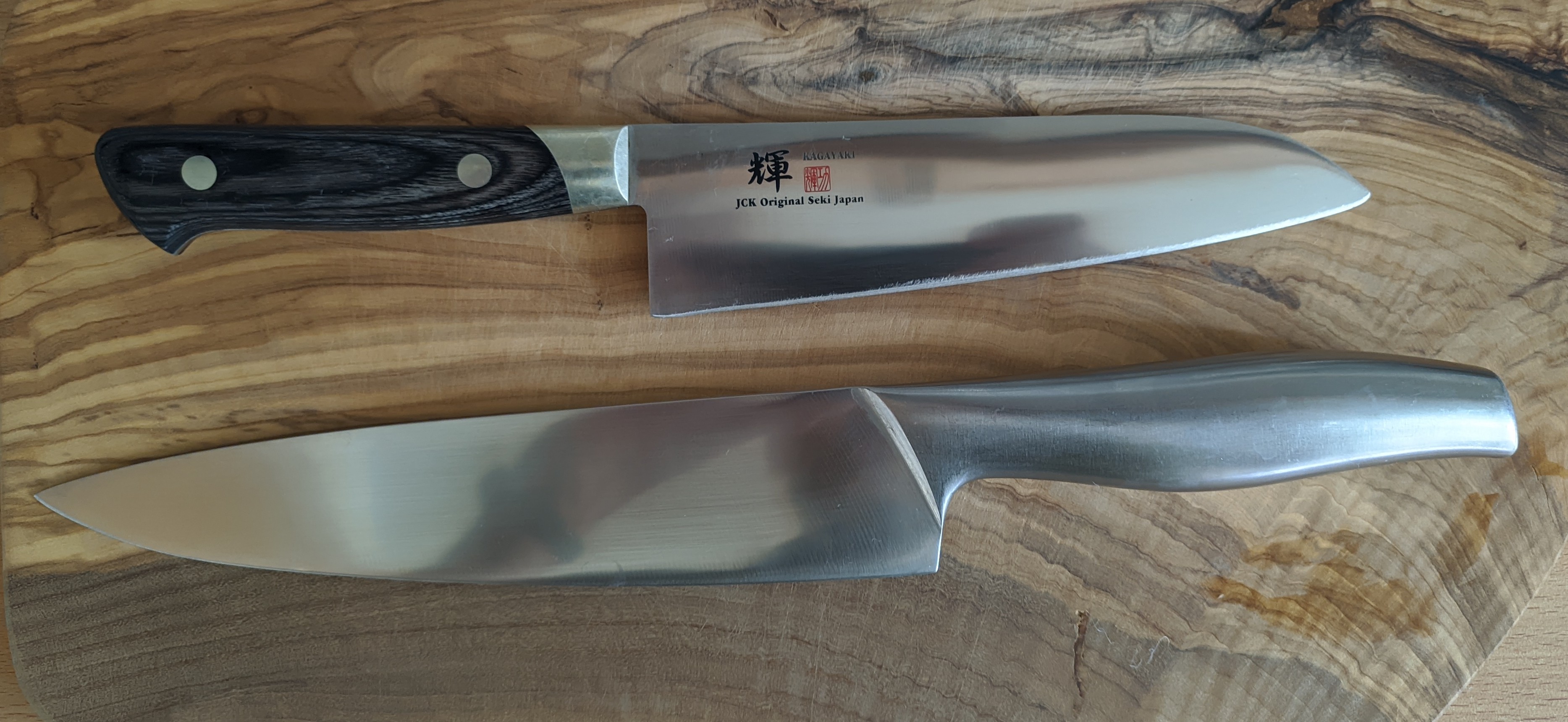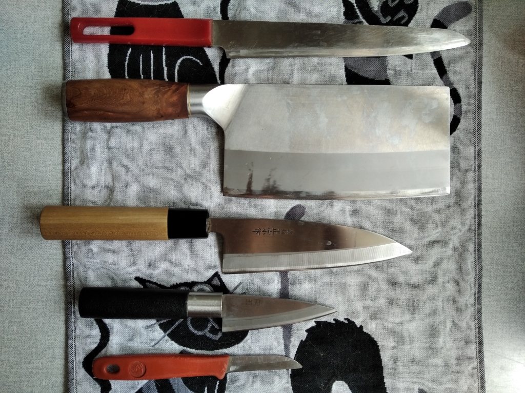 1. Kohetsu 24см (HAP40) - мой основной, тонкий, легкий. Режущая часть из высокоуглеродистой стали, так что покрывается патиной со временем (нельзя оставлять мокрым).