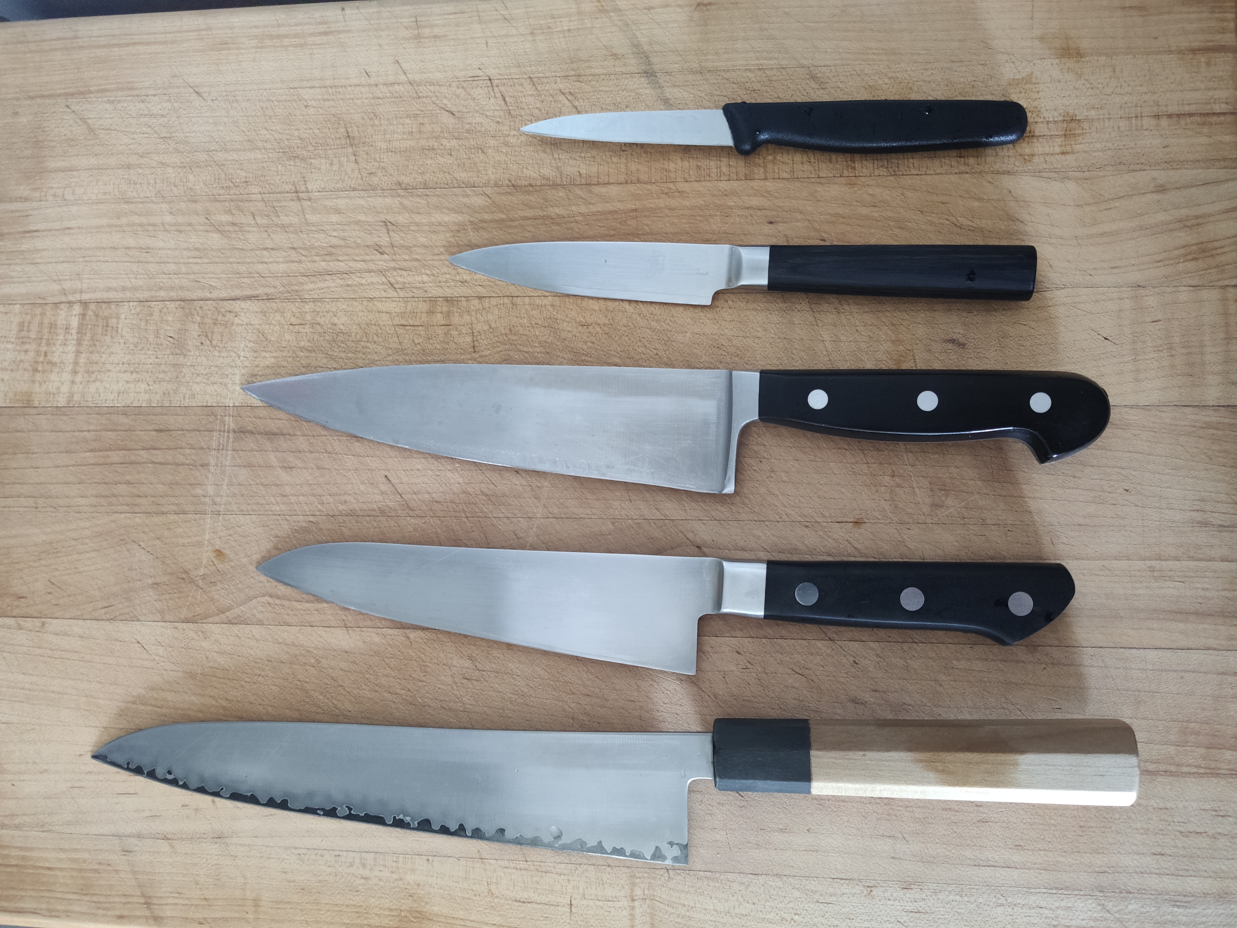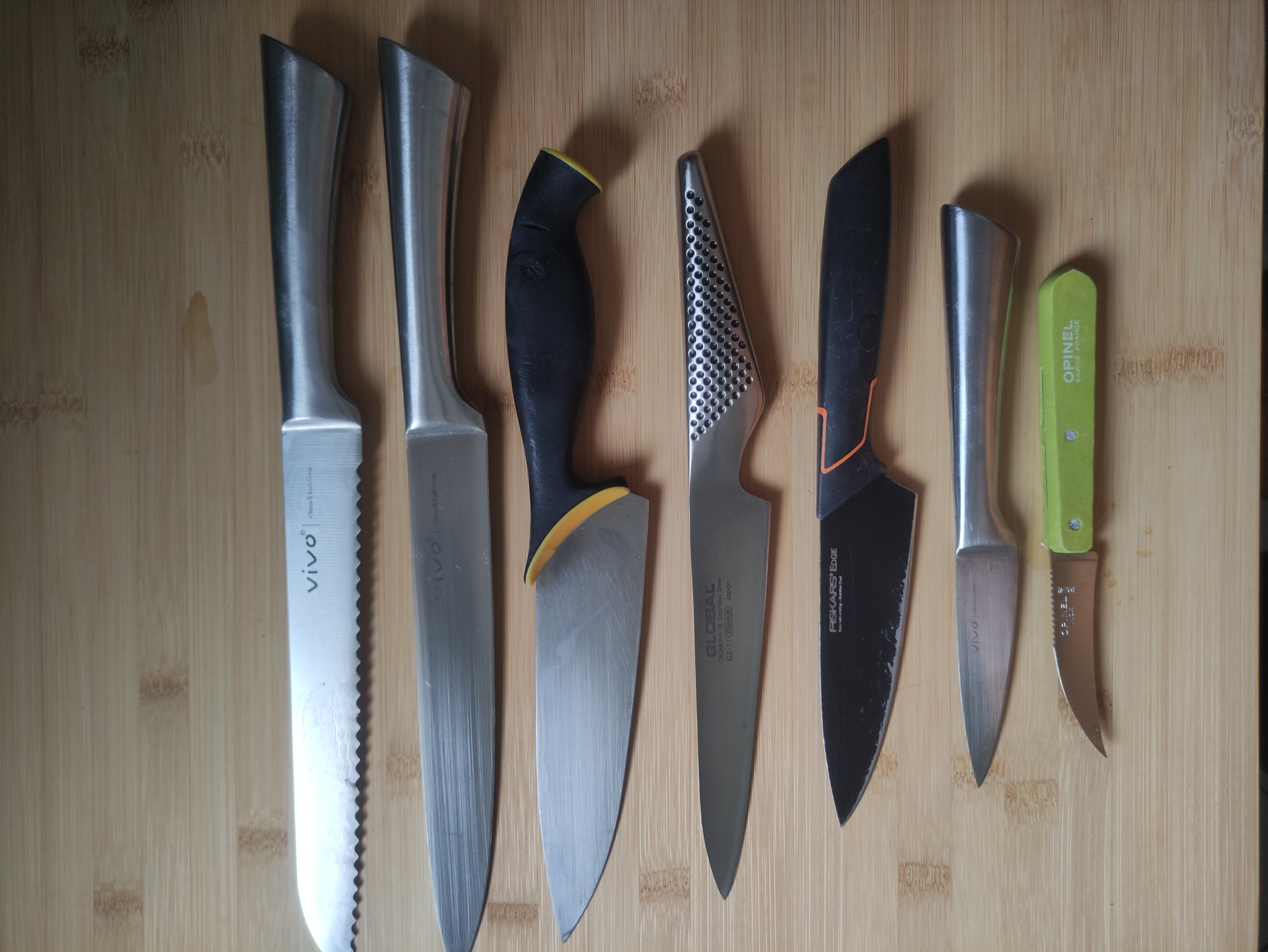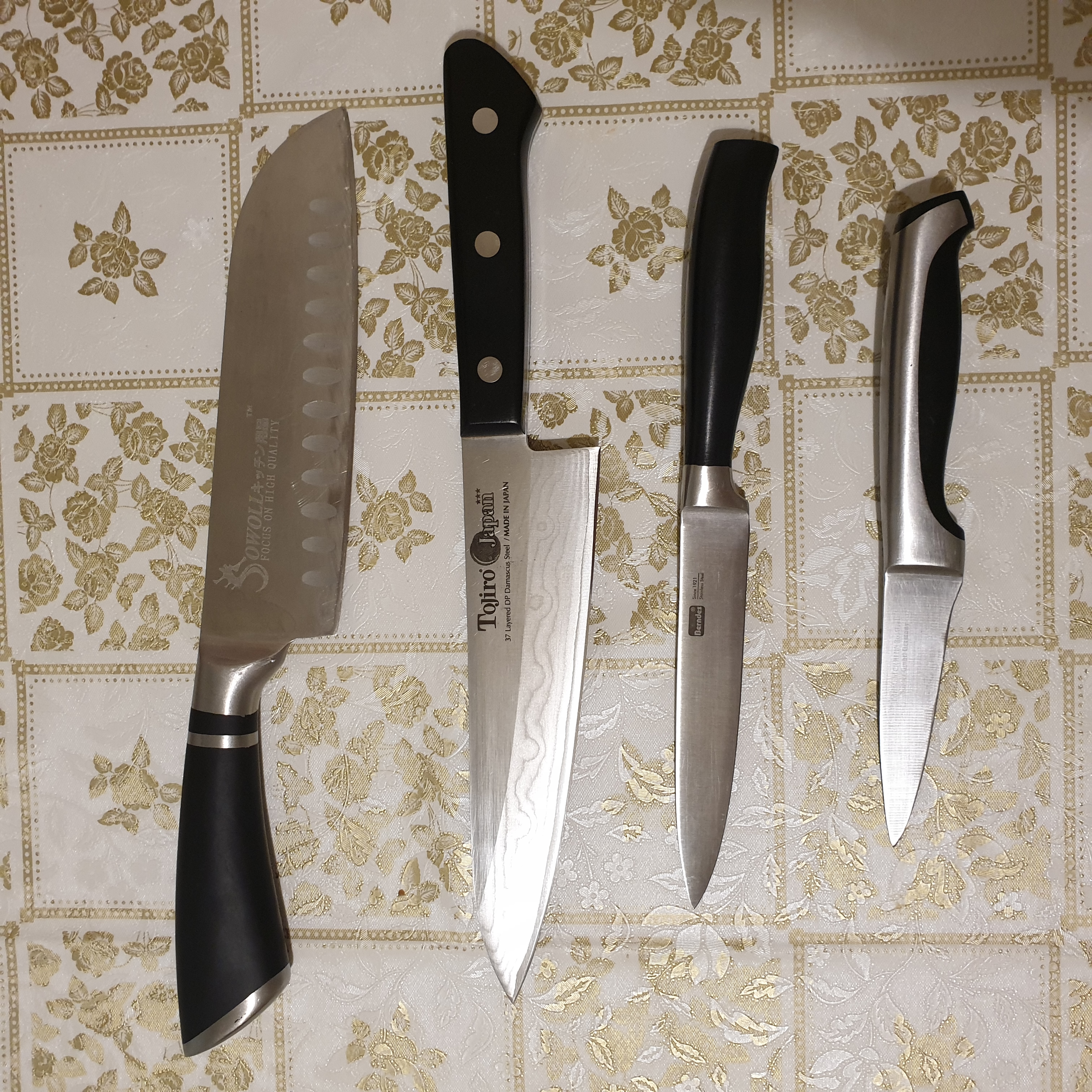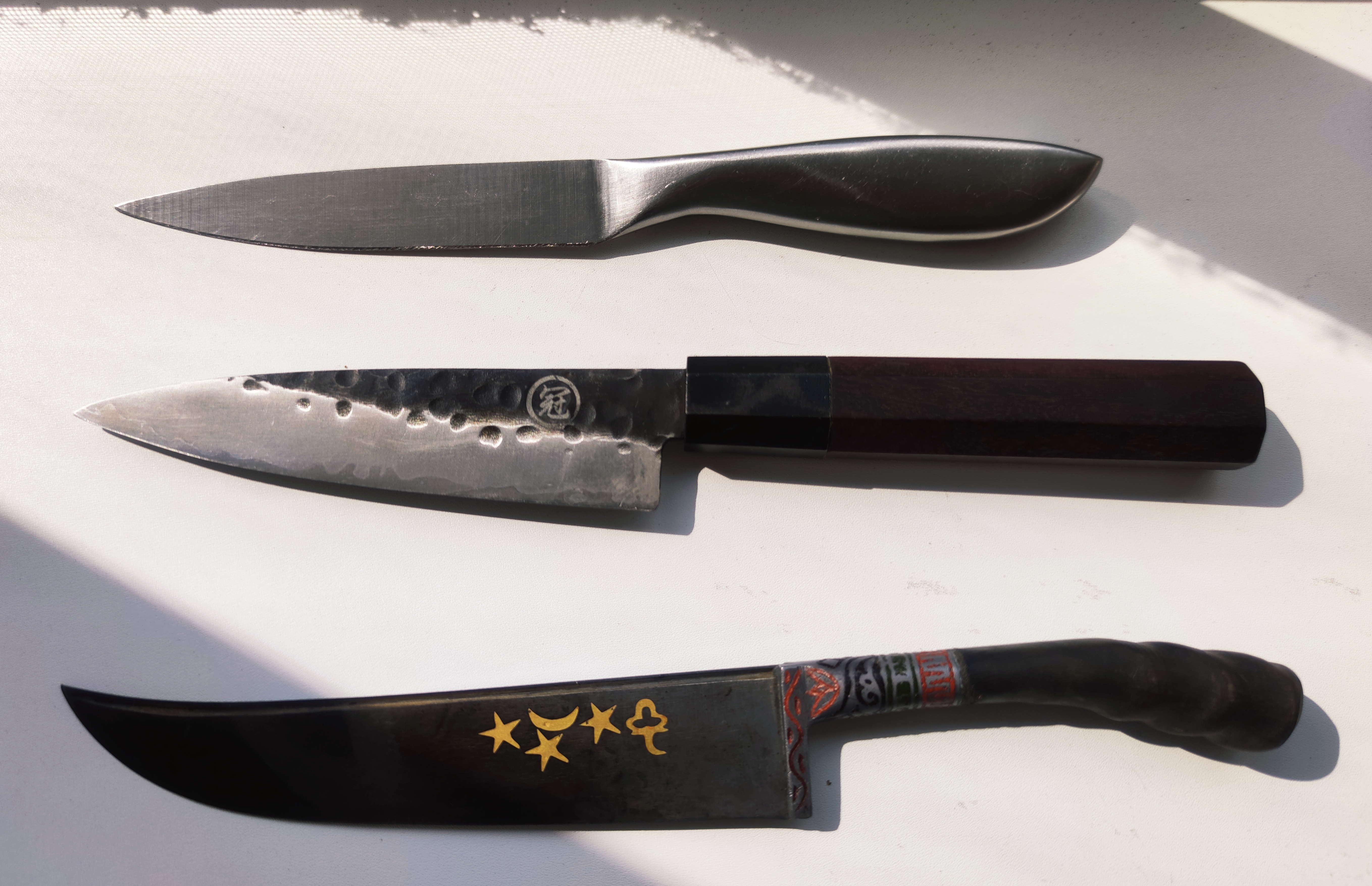 У меня разное беспородное говно, но функционально я понял, что нужны (мне) такие: ну большой шеф понятно. Уж какой получится. Также ясен маленький ножик - причем вот он может быть керамическим, или их может быть два, один керамика, другой сталь.