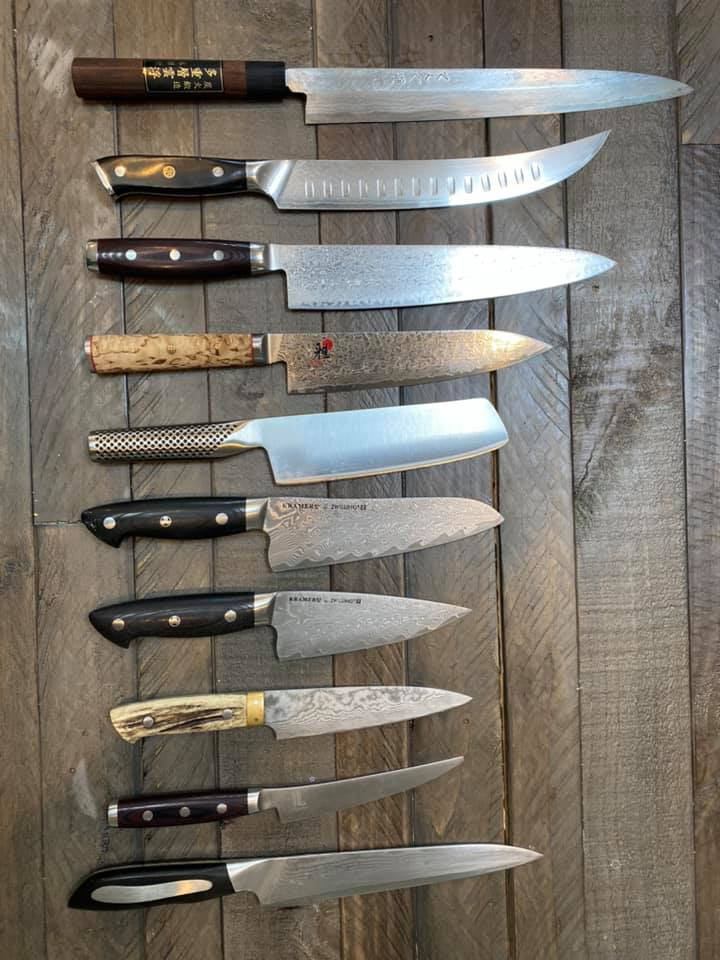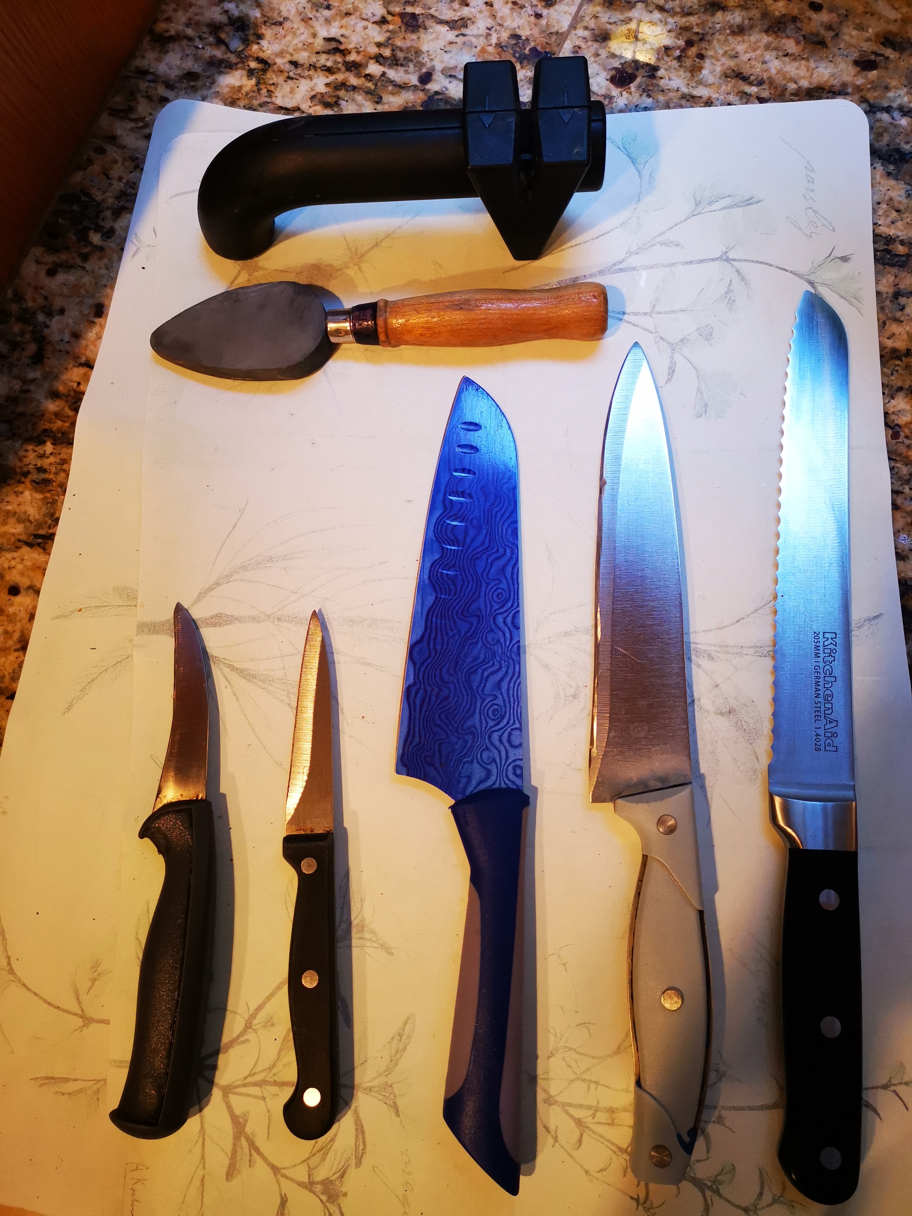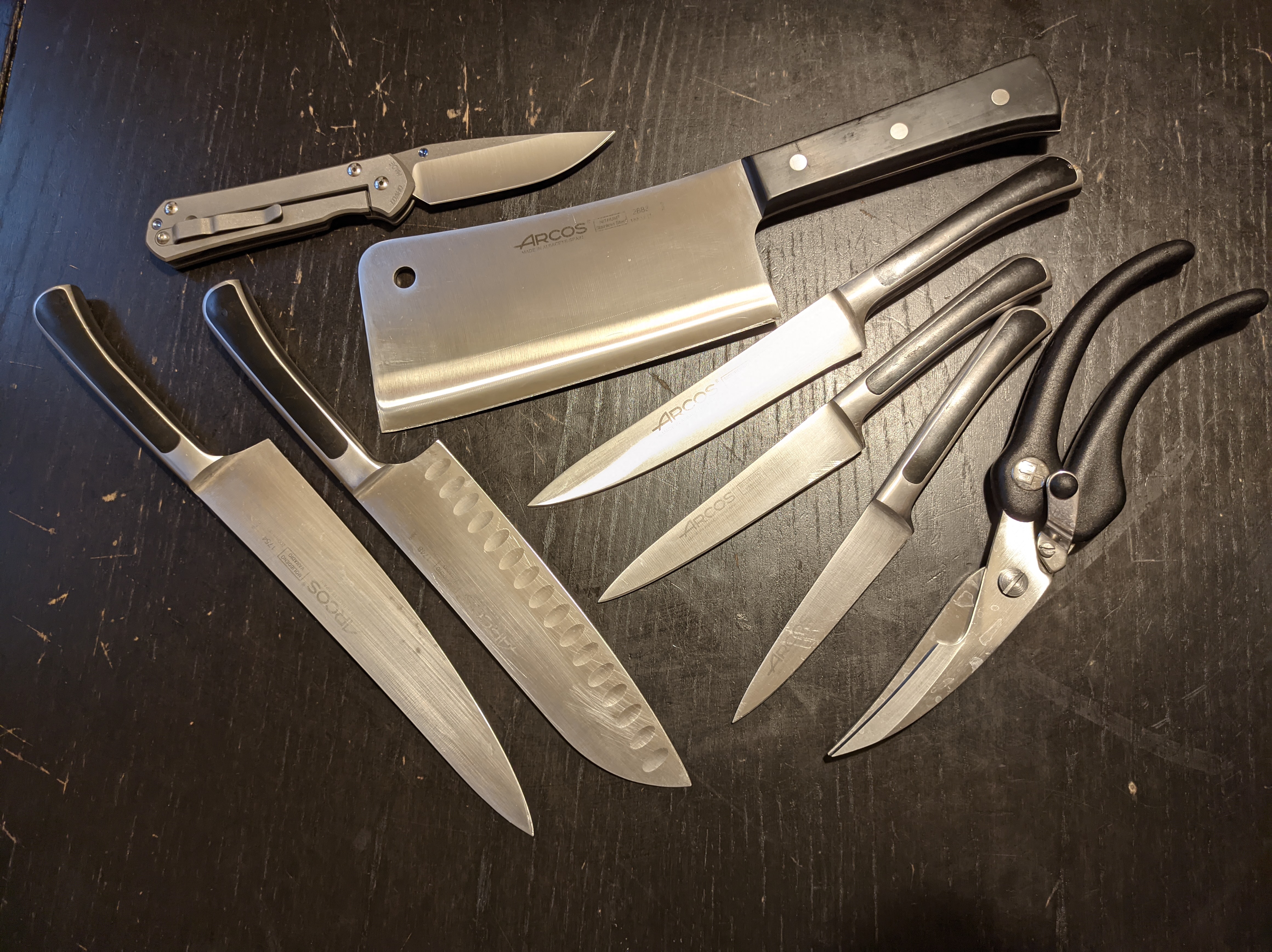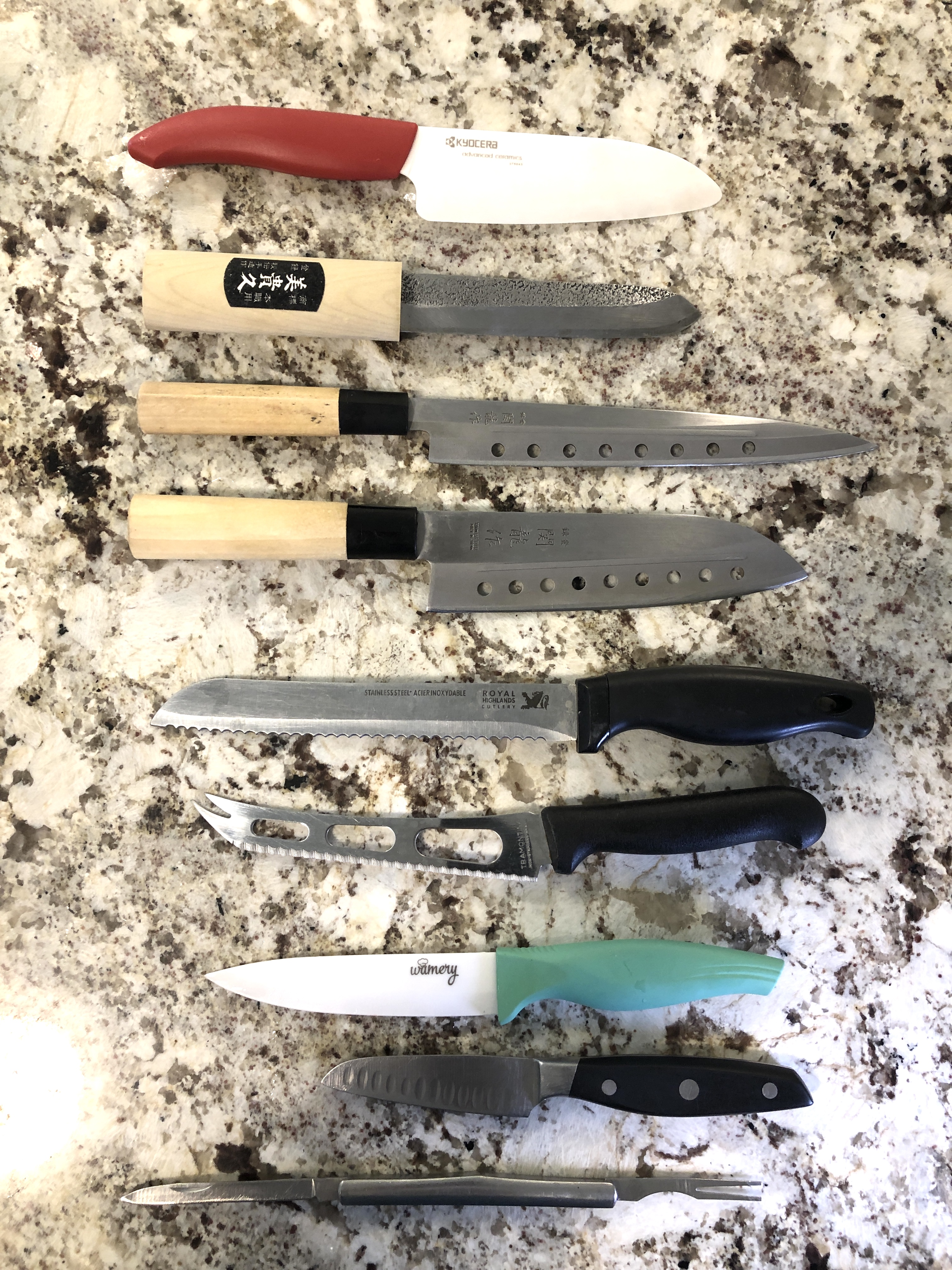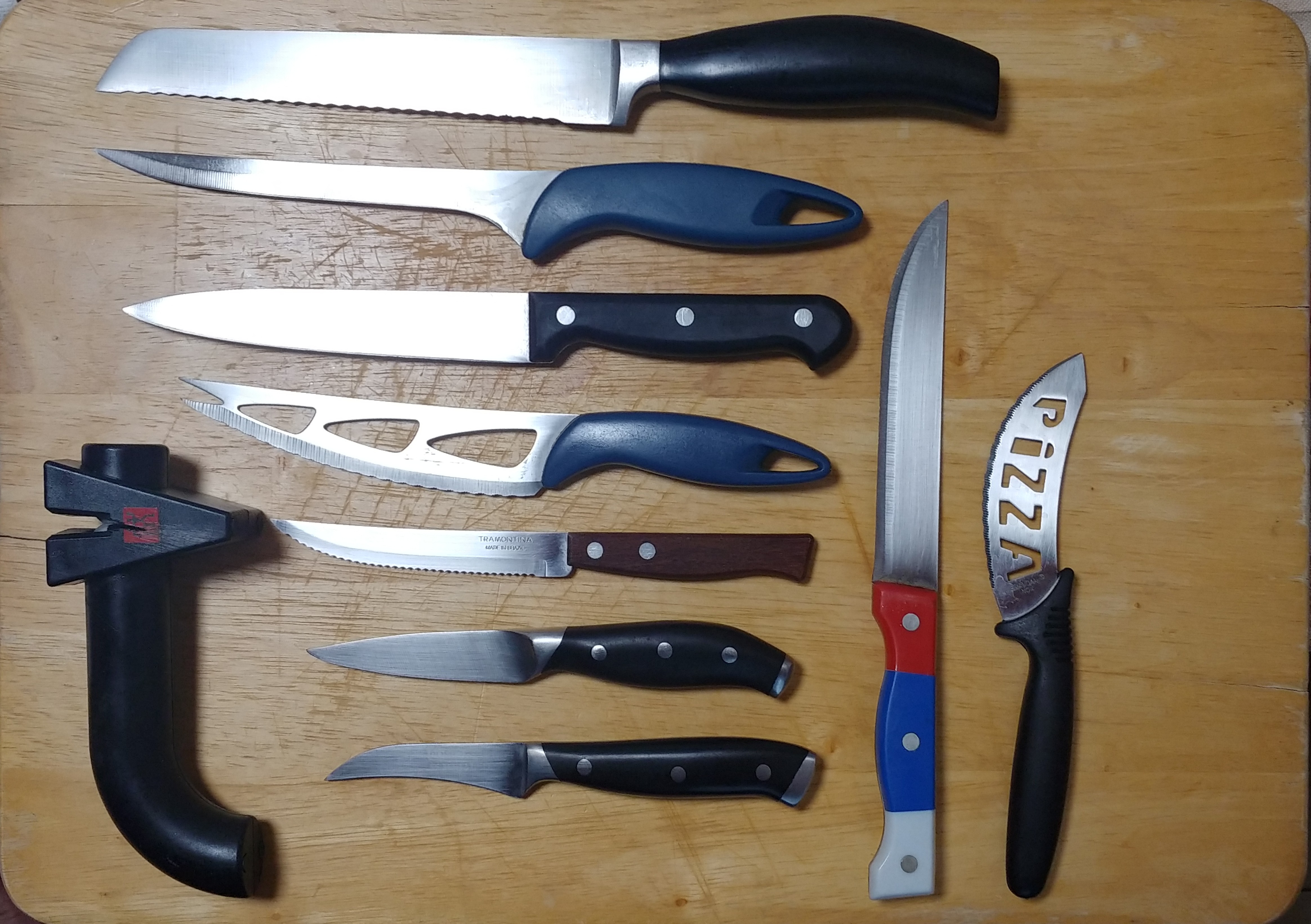 У меня разное беспородное говно, но функционально я понял, что нужны (мне) такие: ну большой шеф понятно. Уж какой получится. Также ясен маленький ножик - причем вот он может быть керамическим, или их может быть два, один керамика, другой сталь.