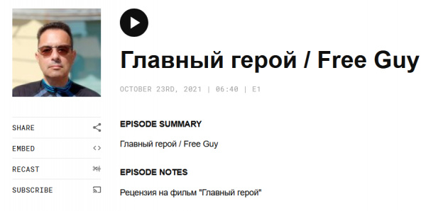 Для теста сделал свой канал подкастов на Simplecast (там пока все потихоньку приводится в чувство) и выложил там первый подкаст: рецензию на фильм "Главный герой".