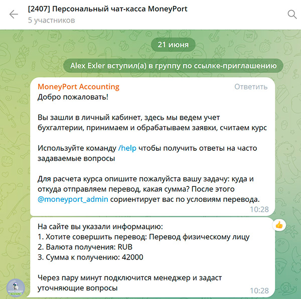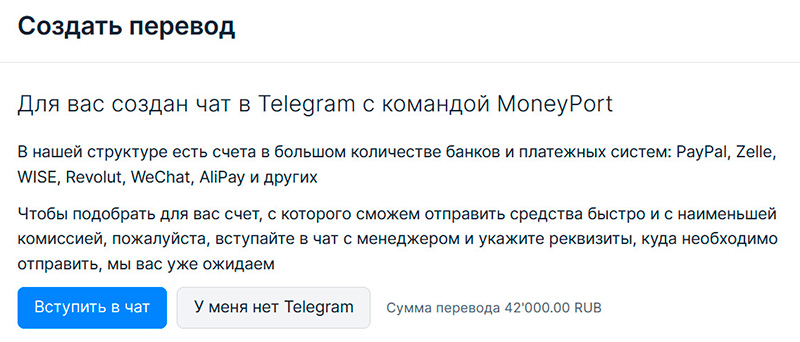 Выбираем опцию беседы с менеджером, для нас создается специальный чат в Телеграм с номером заказа и желаемой суммой в соответствующей валюте: