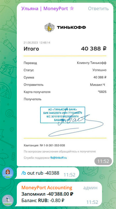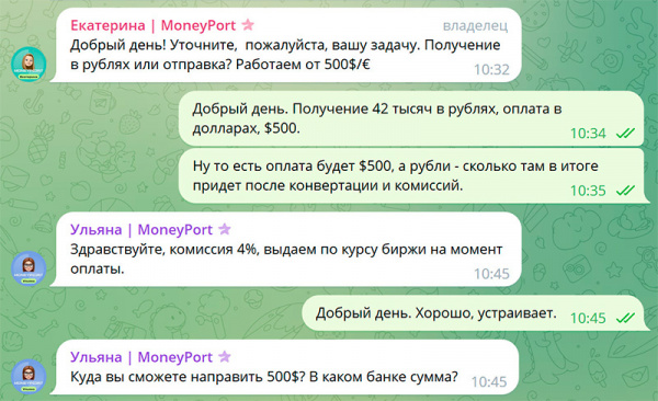 Скажем, те же p2p-криптобиржи требуют гораздо большей технической грамотности, не подходят юрлицам, и никак не помогут вам в случае проблем с банковским финмониторингом - при регулярных переводах вы рискуете блокировкой счёта. MoneyPort, в случае чего, предоставит все необходимые документы для предъявления в банк - на то у вас и есть чат с менеджером, где хранится вся история сделки.