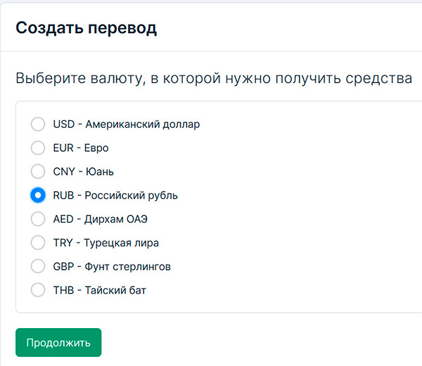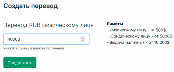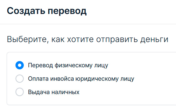При создании перевода есть три возможности: сделать перевод физическому лицу (на карту или на счет), оплатить инвойс юридическому лицу, заказать выдачу наличных.