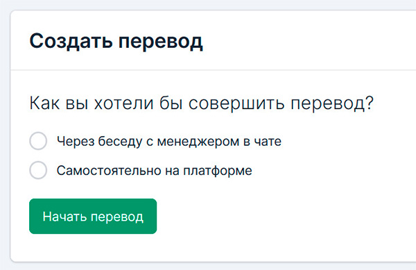 Следующий вопрос - как мы хотим совершить перевод. Впрочем, пока ситуация с изоляцией всех финансовых структур РФ от остального мира не наладится, выбирать второй вариант бесполезно - перевод все равно придётся делать с участием менеджера: он подберёт максимально экономичные опции из доступных.