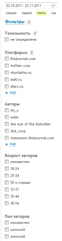При этом есть продвинутая система фильтрации и вы можете комбинировать фильтры так, как вам угодно - например, по датам, платформам (тем же блогам), авторам сообщений, их возрасту, полу и так далее.