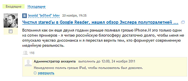 Выданные поручения также отслеживаются в специальном разделе. Если поручение выполнено, можно поставить отметку "Завершено" и дать свой комментарий - например, "Критикующему выдана шоколадка, и он успокоился" или "Критикующего успокоили безо всякой шоколадки - навсегда".
