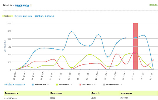 По тональности сообщений (положительная, нейтральная, отрицательная) можно получить наглядные графики, выбрав любой временной промежуток. По таким графикам также очень удобно отслеживать результаты рекламных кампаний.