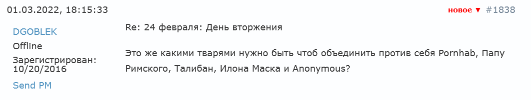 Пообщавщись с различными людьми и особенно - в сети, я пришел к выводу, что вступать в моральное противостояние со сторонниками "спецоперации", сильно пораженными "патриотизмом верхней части головы ПВГ", нет никакого смысла. Однако иногда поступить по-Овечкину (рассказ "Мичман Тоня") невозможно. В таки случаях остается возможность "санкций".