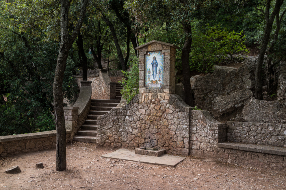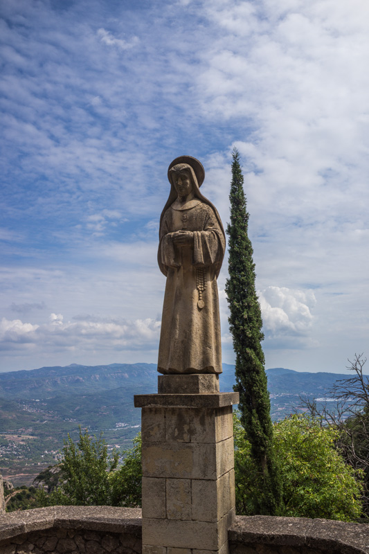 На вершине скалы видно распятие. Туда можно дойти пешком и отсюда, и сверху, куда поднимается фуникулер.