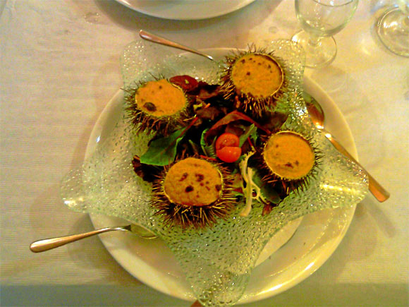 ИМХО, это были ежи, фаршированные чем нибудь вкусненьким. "Как есть" ежи выглядят как пустая скорлупа каштана, испачканная изнутри какой-то слизью. Эту слизь следует аккуратно собирать маленькой ложечкой, смаковать и убеждать себя, что это оооочень полезно.