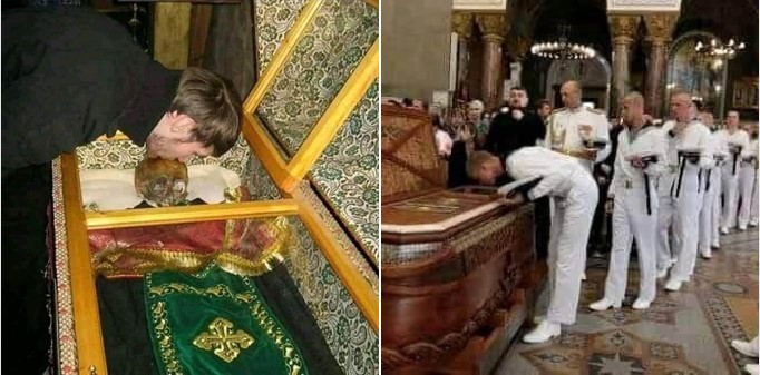 где какой-то мужик в черной одежде целует чей-то череп.И в комментах что-то типа: хаха, русня, некрофилы, сектанты!