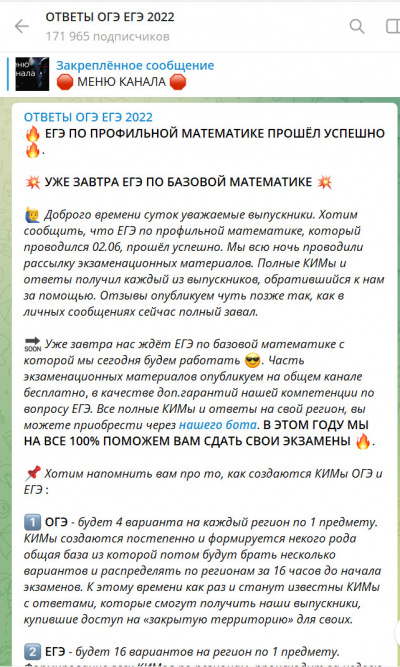 В Телеграме как грибы после дождя растут каналы, на которых продают якобы "Ответы на ОГЭ и ЕГЭ". Их уже несколько десятков, у каждого из них не одна сотня подписчиков. Тексты там публикуются одинаковые, при этом не очень понятно - все эти каналы (в каждом из них заявляют, что "только мы - настоящий канал с ответами, остальные каналы - мошенники) управляются из единого центра или кто-то просто пытается присоседиться к выгодному мошенничеству.