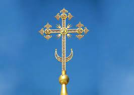 "Религиозная традиция считает купольный крест с полумесяцем символом Церкви-Жены в соответствии со словами из Апокалипсиса: «И явилось на небе великое знамение: жена, облеченная в солнце; под ногами ее луна» (Откр. 12:1). Поэтому, кстати, некоторые кресты имеют лучи, расходящиеся из средокрестья."