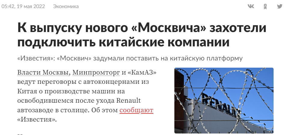 Добавим к этому такой момент, что типичный китайский авто использует немецкие и другие детали, то им безусловно очень интересно остаться без доступа к оным ради возрождения "Москвича".