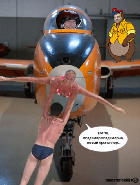Не лишним заметить будет, что на плечах у нее - шкуры убиенных животных (это для веганов и зоозащитников), а цвет ботильонов невозбранно намекает на белогвардейцев, чей дух рядом с макетом красноармейского самолета совершенно неуместен.