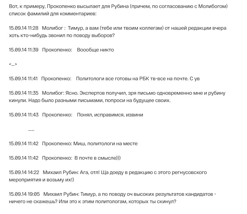 Слив рупора Кремля Михаила Рубина. Этот пропагандист участвовал в обсуждении медийной атаки на Украину и участвовал в подготовке публикаций вместе с заместителем руководителя администрации президента* РФ Тимуром Прокопенко. 24 сентября 2014 года в личной переписке Рубин и Прокопенко обсуждали тему «массовых захоронений» под Донецком, договаривались о подключении к теме УПЧ Памфиловой, и уже на следующий день 25.09.14 вся сетка подконтрольных АП медиа разгоняла новость с целью формирования общественного мнения о массовых нарушениях и якобы истреблении населения в Украине.