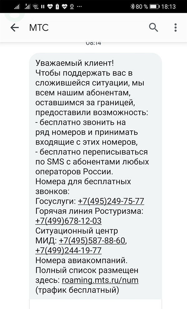 МТС - весьма гнусная контора! С начала года "отрубила" мне три! СИМки. Сначала, 1 января прекратили работать две мои и недавно отрубилась СИМка у жены. СИМки уже достаточно древние, но это ничего не меняет. Они просто перестали работать в роуминге от слова "совсем" (переставлял в др.телефоны, вручную сканил диапазон и т.д. - бесполезно). При этом МТС еще отказывается признавать сиё деяние. Говорят, у нас всё хорошо; сам - дурак! Дальше - больше. Пробовал заказать доставку "замены", отказали, типа у нас в базе данные паспорта не те. Повторно заказал с правильным номером. Ответ был еще круче: А! Раз у Вас уже новый паспорт, тем более не вышлем, пока не придете лично в салон и не внесете изменения. На то, что границы закрыты и ничего никуда не летает им глубоко... Думал прокрутить вариант с доверенностью, но Российское Консульство тоже давно на замке. Доступ к счетам потерян, ни за что не заплатить, никому перевод не сделать, поскольку Сбербанк гнет ту же линию: поменять привязку телефона к онлайну банку можно только физически через разные действия, находясь в стране, в которую сейчас вернутся никак не получится. Если бы не Wi-Fi Calling режим на телефоне (можно бесплатно звонить из-за границы на короткие номера провайдера, Сбера и других контор, плюс бесплатно принимать входящие звонки и звонить на прочие Московские номера по своему домашнему тарифу) на все эти многочасовые дурацкие переговоры со всеми ушла бы уже не одна тысяча долларов. На этом фоне возможность позвонить на Госуслуги и в Ростуризм, это, конечно, "охрюнительно!" Но, судя по воплям соотечественников, доносящихся из разных уголков мира, там тоже успешно "клали" на чужие проблемы! Кстати, такой СМСки не приходило. Была только одна на заполнение обязательной спец.формы на Госуслугах, если я вдруг каким-то образом "доползу" до пограничной стойки в Шереметьево. Было сказано, без формы границу пересечь будет нельзя.
