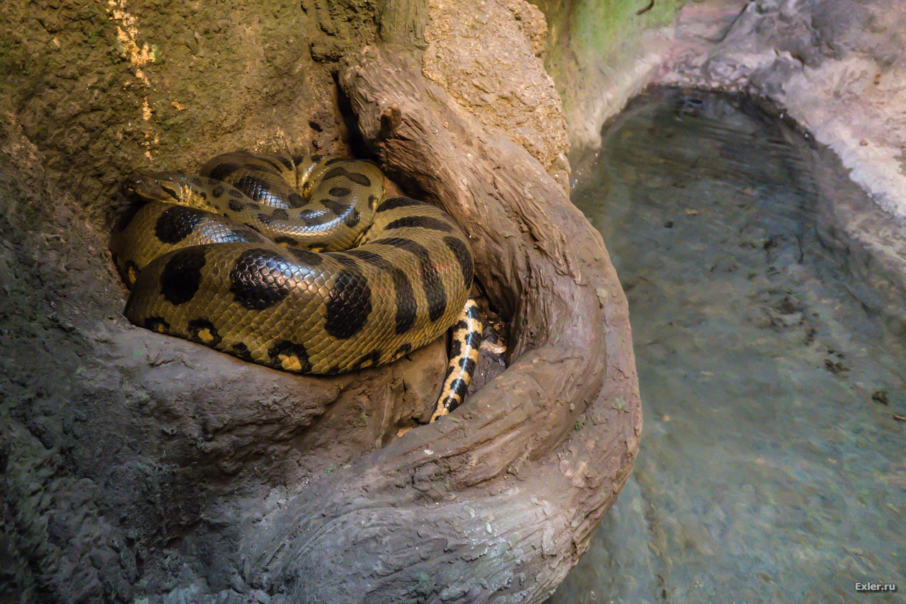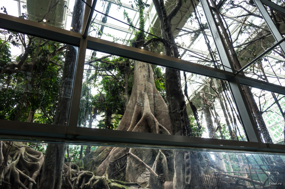Пошли внутрь, в джунгли. Сначала идут как бы аквариумы (часть джунглей за стеклом). Змея.