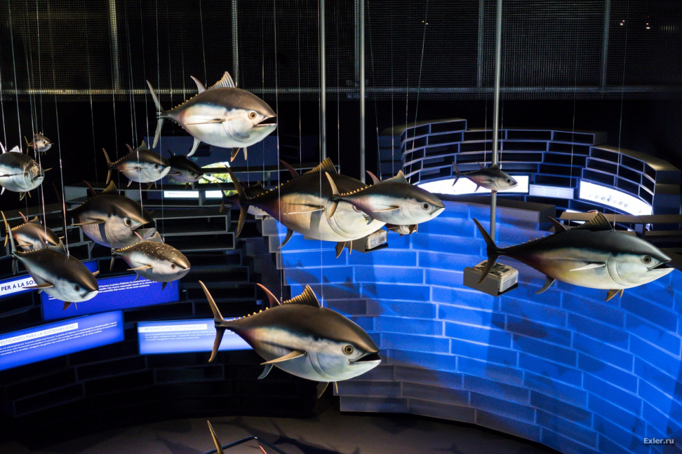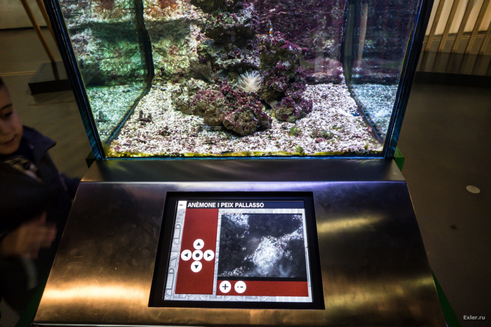 Куча аквариумов с рыбками и кораллами, где можно на дисплее увеличить любую область.