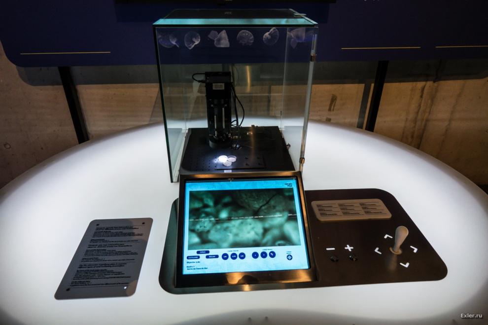 Вот таких стендов тут много. Микроскоп, препарат, компьютерная трансляция на дисплей и возможность всем этим делом управлять.