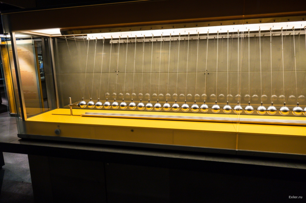 Волновое движение: нужно нажать кнопку, механизм оттянет первый шар и запустит его, чтобы показать движение шаров.
