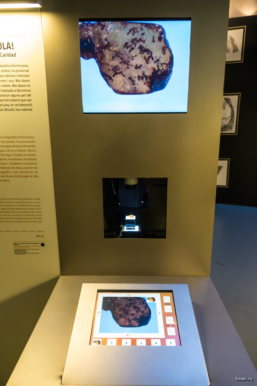 Янтарь с насекомыми. Есть стенд, на котором это все можно посмотреть на дисплее через микроскоп.