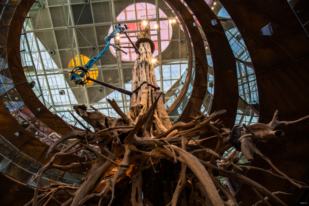 Касса и вход - на нулевом этаже, а далее "Космокайша" идет вглубь аж на пять огромных этажей. И осмотр экспозиции начинается с минус пятого этажа, куда спускаешься вот по такому пандусу, обходя со всех сторон огромное "Древо жизни".