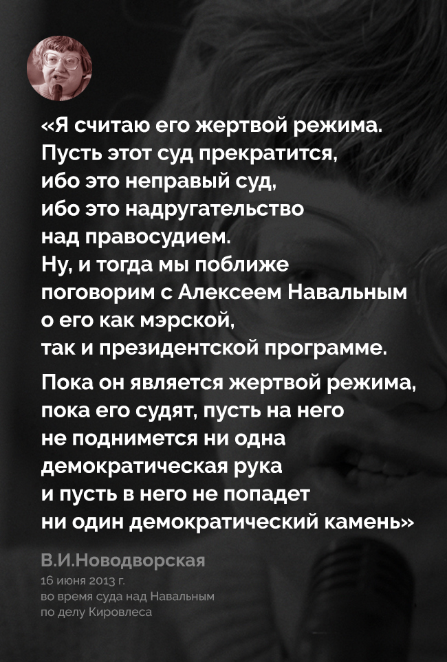 «Политическое направление Навального — это популизм и национализм. Наиболее точно, на мой взгляд, его суть сформулировала в 2011 году Валерия Новодворская: Навальный может стать «будущим лидером обезумевших толп, да еще и с нацистским уклоном».