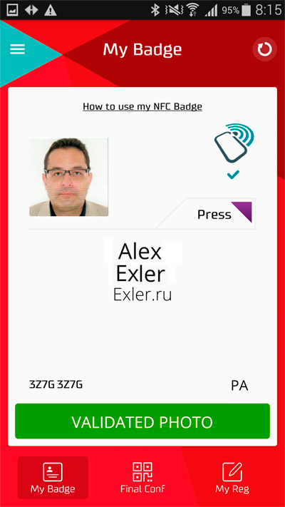 Но я, собственно, не об этом. Раньше для получения баджика нужно было переться в Барселону за день-два до выставки - чтобы не стоять в диких очередях. А сейчас они перешли на новые технологии: никуда переться не надо, просто скачиваешь приложение, логинишься и получаешь NFC-баджик, с помощью которого можно проходить на выставку. Красота!