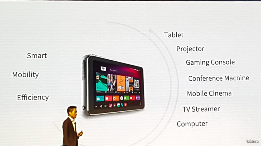 Далее пошли маркетинговые заклинания о том, что это умное устройство, мобильное, эффективное, что это планшет (кто бы сомневался), проектор, игровая консоль (потому что планшет), устройство для конференций (потому что два динамика и два микрофона), мобильный кинотеатр (потому что проектор), TV-стример (потому что планшет) и компьютер (потому что планшет). Странно, что не упомянули такие важные качества, как возможность использовать мессенджеры, выходить в Интернет и служить гнетом для засолки капусты, потому что весит эта штука килограмм.