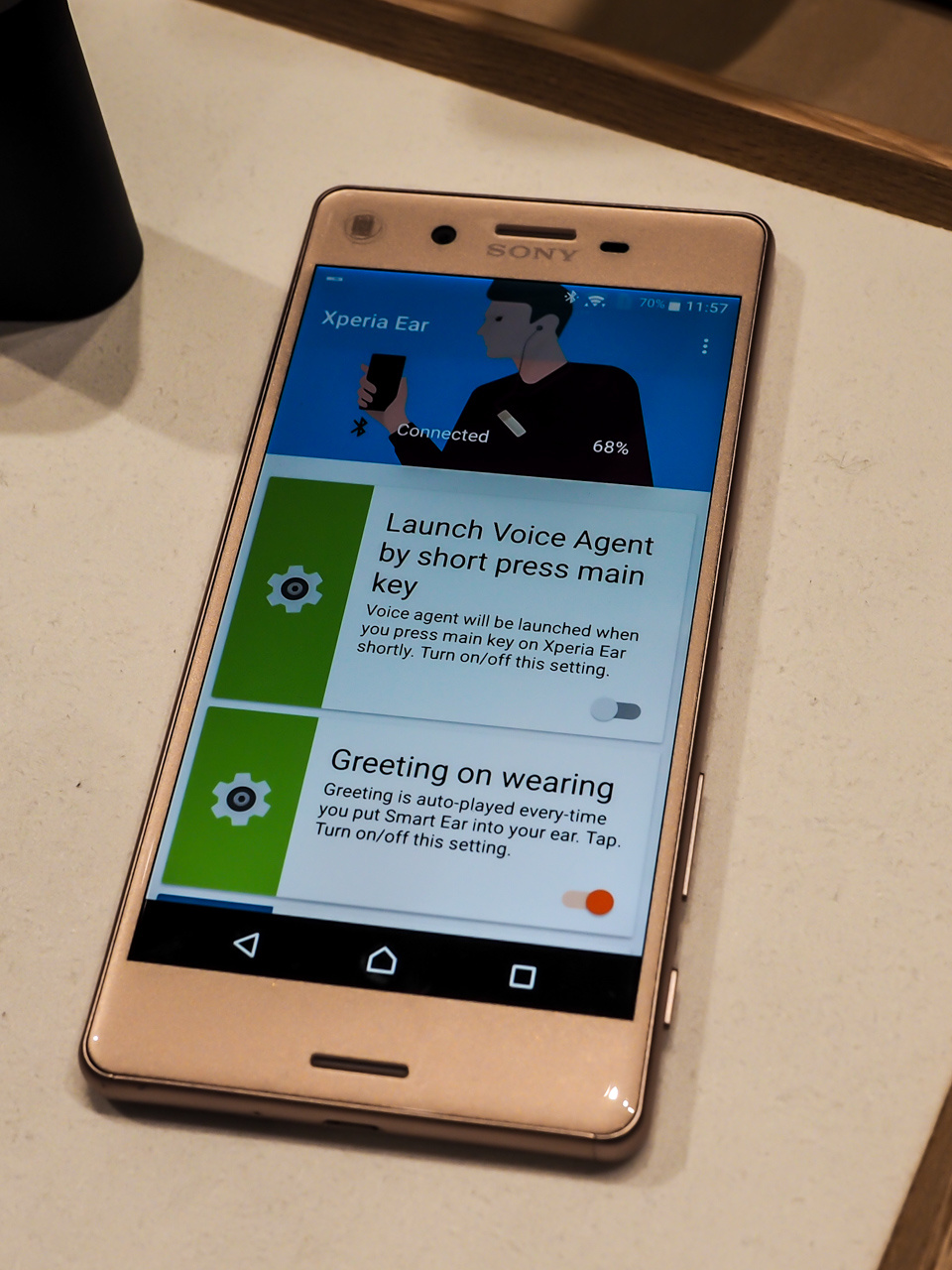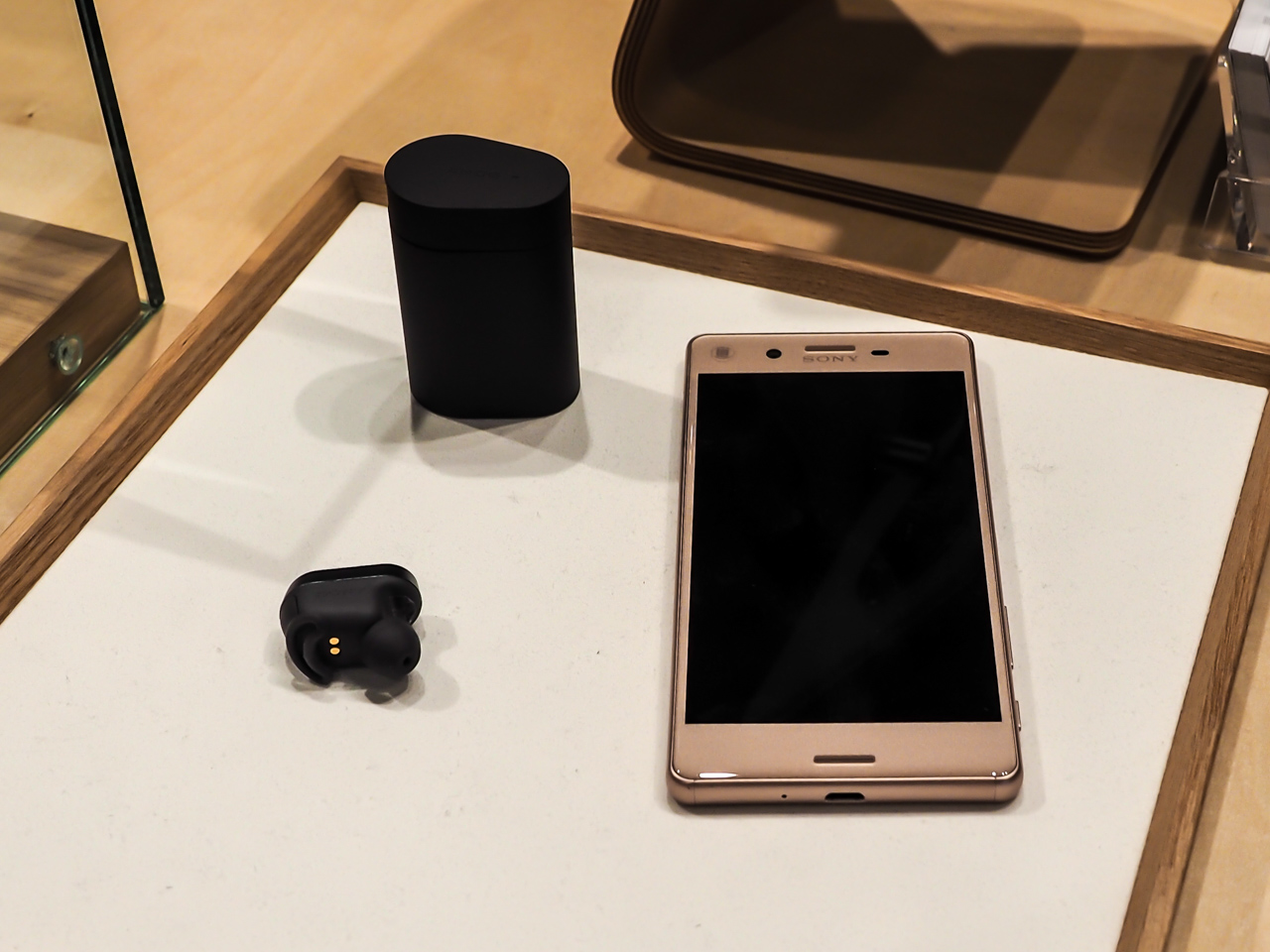 Ниже - новые миниатюрные беспроводные гарнитуры Xperia Ear. Имеют управляющую кнопку на корпусе и с помощью приложения на смартфоне умеет выполнять самые разнообразные голосовые команды: сообщить новости, позвонить кому-то, напомнить о событиях из календаря, управлять аудиоплеером, прочитать пришедшую SMS, построить навигацию до заданной точки и так далее.