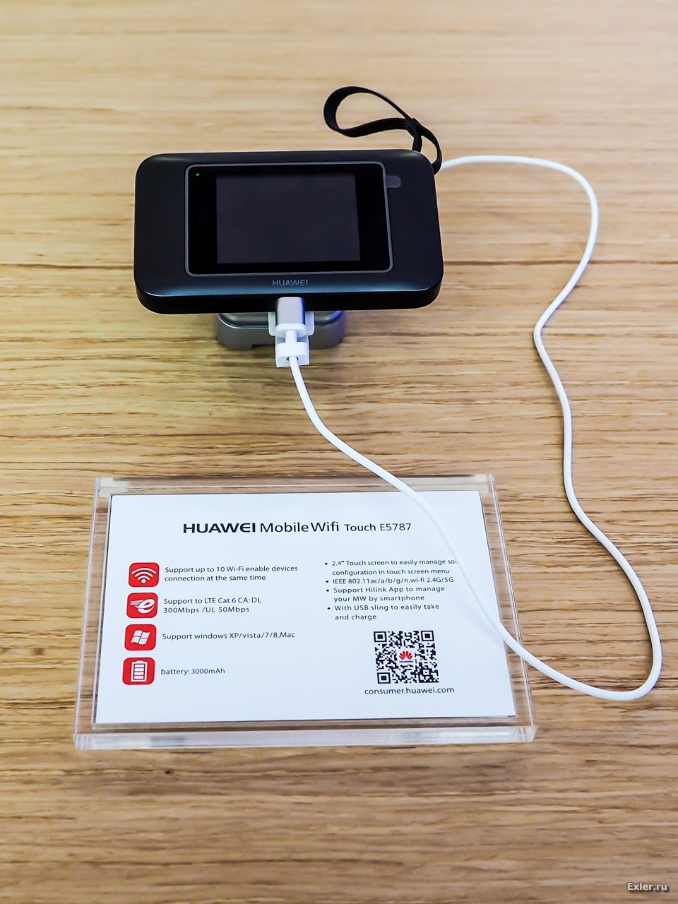 Новая версия мобильного LTE-роутера с Wi-Fi - Huawei Mobile WiFi Touch E5787. Компания славится своими мобильными роутерами, я сам использую Huawei E5776 и вполне им доволен до сих пор.