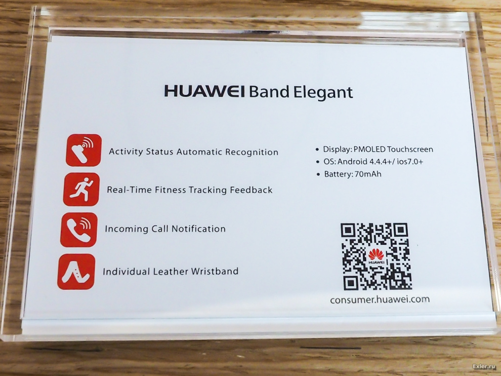 Фитнес-трекер Huawei Band Elegant. Отслеживает активность, информирует о входящих звонках. Мне не слишком понятно, почему его сделали именно так: и не чисто фитнес-трекер, который обычно совсем маленький и легкий, и не "умные" часы, потому что функциональность сильно урезана и дисплей монохромный.