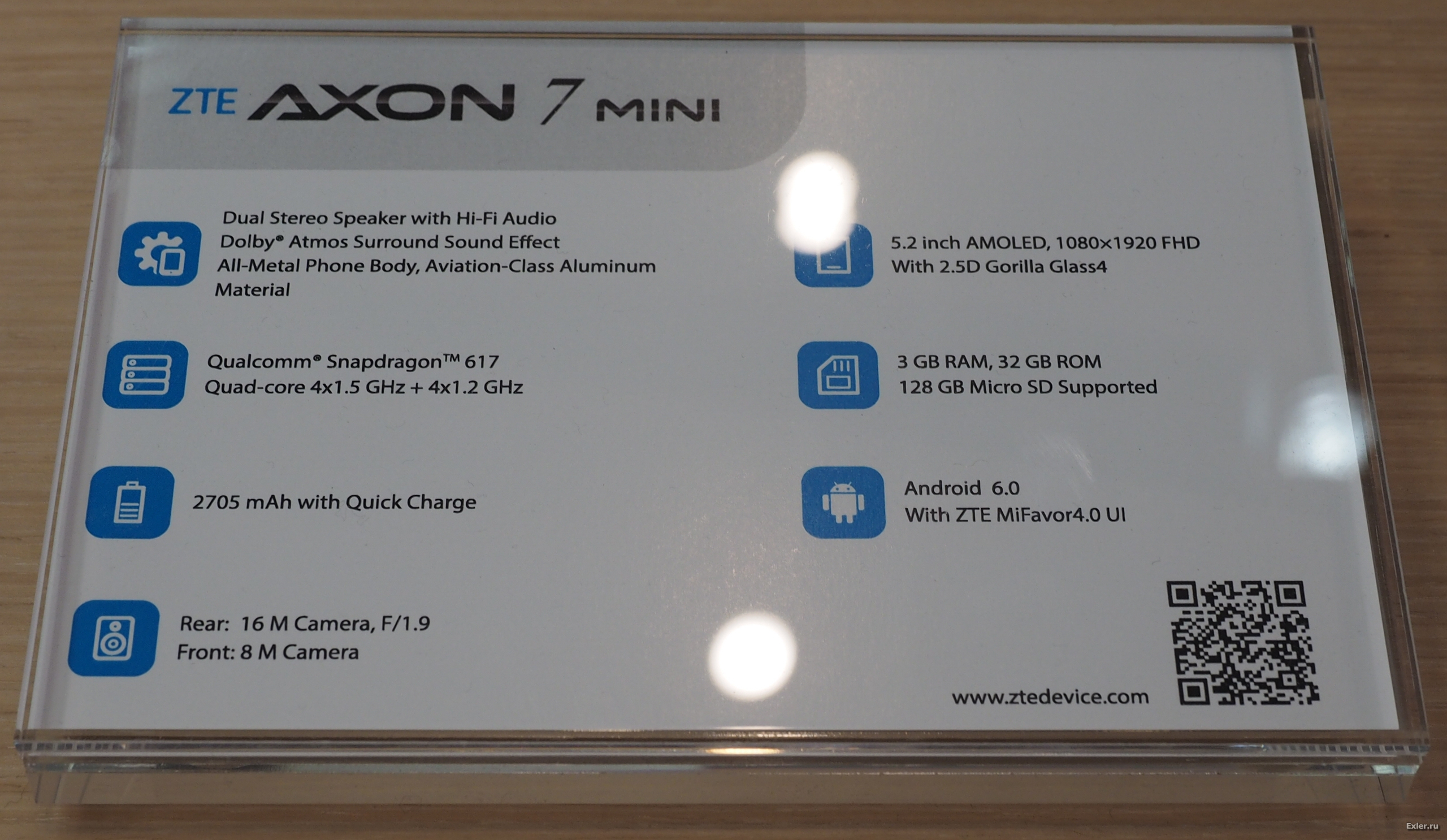 А вот Axon 7 Mini на Axon 7 похож один в один, только слегка поменьше. Это для тех, кто не любит большие размеры дисплеев. Здесь 5,2". Да-да, это по нынешним временам и называется "маленький дисплей".