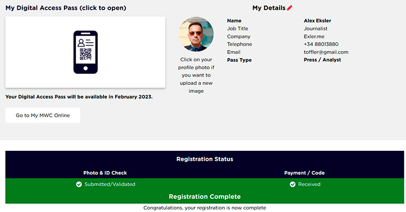 Прикол: мне, оказывается, дали аккредитацию на MWC 2023. Я все никак не мог запрос на аккредитацию довести до конца: там совершенно идиотская система добавления и верификации ID, которая в упор не желала верифицировать мой испанский ID. Потом я просто чисто ради хохмы подсунул ей российский зарубежный паспорт, и она его неожиданно приняла. Это было вчера, я сегодня просто полюбопытствовать зашел, а там дали аккредитацию. Ну, скатаюсь тогда завтра или послезавтра, раз такое дело.