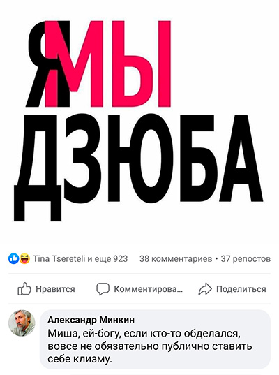 Upd: Интересно. Михаил Козырев у себя в Facebook выложил такой же значок "Мы - Дзюба" и написал слова поддержки футболисту. Ему на это ответил журналист Минкин. По мнению Минкина, если у тебя взломают телефон/компьютер и выложат твои интимные видео в Интернет, то это ты - обделался. Мне прям интересно: когда у самого Минкина взломают телефон или компьютер и выложат его интимные видео в Интернет, он честно признает себя обделавшимся или будет что-то лепетать о негодяях и о том, что как они смеют публиковать его личные видео?