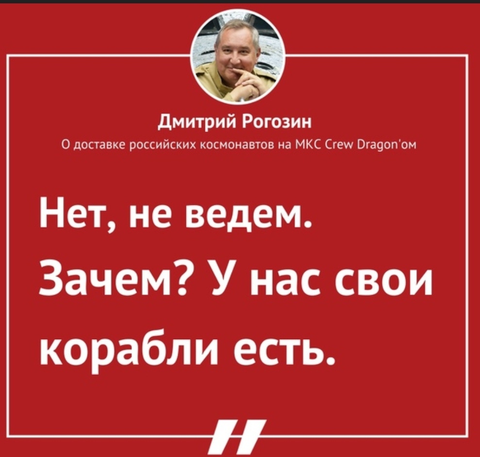 Если уж кому Маск и перешёл дорогу так это не Роскосмосу и лично придурку Рогозину, а Боинг-Спейс. Сидели себе ребята, спокойно пилили бюджетное бабло сотнями миллиардов. Кормили "завтраками" налогоплательщиков и сменяющихся президентов на протяжении десятков лет, не забывая напоминать о увеличении финансирования. И тут приходит какой то хер с бугра и за 6 лет делает многоразовый РК, который практический не падает, да ещё и многразовость успешно подтвердивший. А потом ещё и космический корабль в кротчайшие сроки. А Боинги свой орбитальный аппарат никак из прототипов вывести не могут. И тут бы взорваться пуканом про распил, рукожопство и распиздяйство... Но это же Роскосмос, поэтому лучше вообще про это упомянуть не будем. Лучше зачем-то негров вспомним...