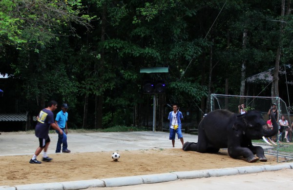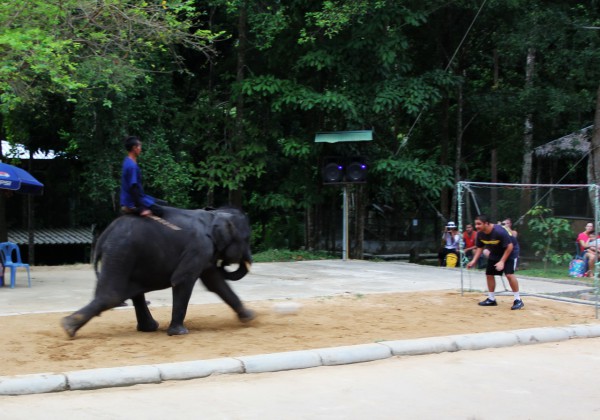 Потом пришел черед футбола. Сначала слон забивал в ворота, на которых стоял боевой парень из зрителей, потом парень забивал слону.