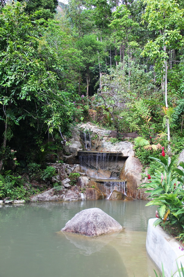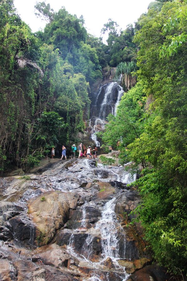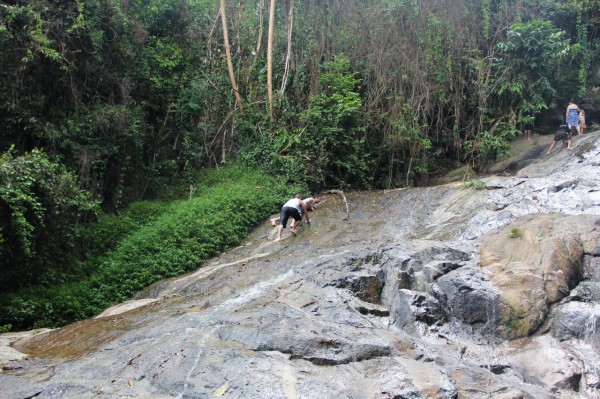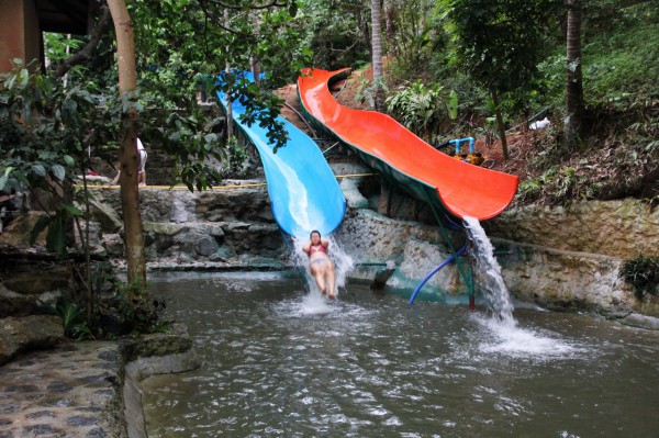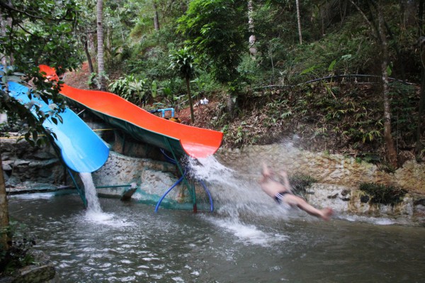 Где-то на середине пути к водопаду обнаружилась мини-аквапарк из двух горок. По ним можно было скатиться и плюхнуться в холоднющую воду небольшого бассейна горной речки. В условиях жары и сильной влажности это было очень даже приятно.