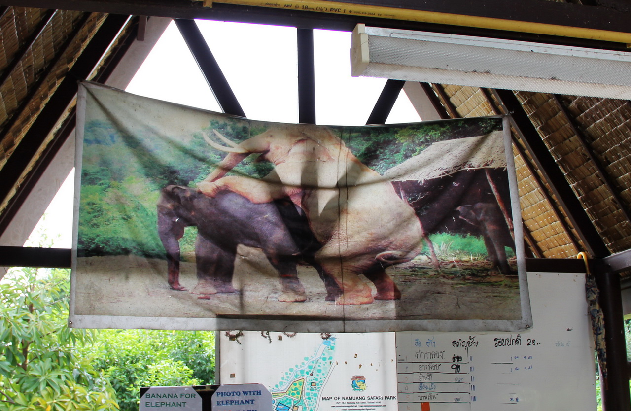 Слоны используются разнополые, так что временами, когда какая-нибудь слониха особенно изящно повернется, случаются небольшие казусы, о чем предупреждает фотография, висящая на помосте.