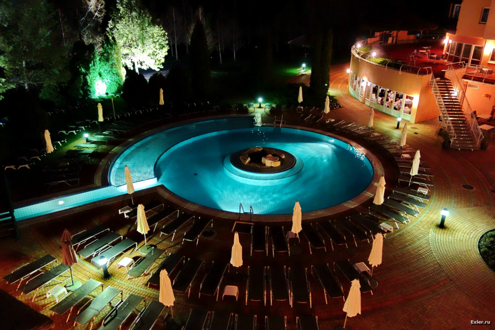 Поселили нас в отеле Lotus Therme Hotel & Spa. Очень симпатичный отель с бассейном, в котором теплая вода из термального источника. Из бассейна раздавались песни Аллы Пугачевой: прекрасные русские женщины после обильного ужина с дегустацией венгерских вин развлекали себя плаванием и пением. Кстати, пели очень прилично. Я это даже заснял на видео, но выкладывать, конечно, не собираюсь: мы с Бубликом уважаем право людей на приватный отдых.