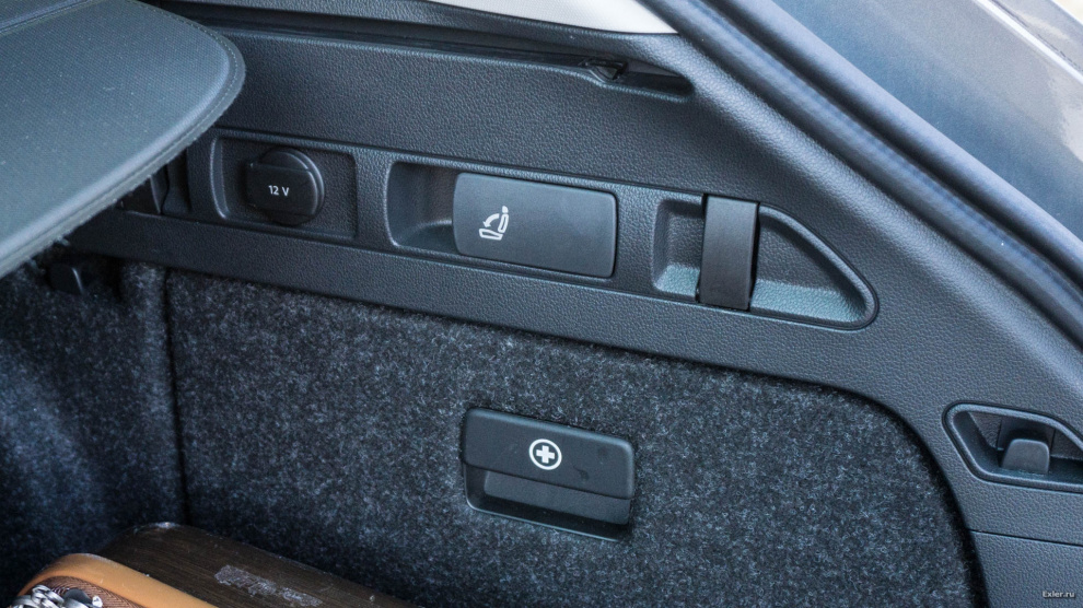 Справа - розетка на 12V и также кнопка откидывания задних сидений. Справа размещен специальный закрывающийся отсек под аптечку.