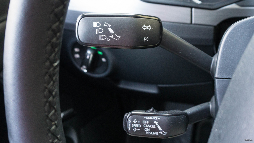 Круиз-контроль здесь регулируется с помощью отдельной ручки на руле. Кстати, здесь также есть специальный датчик света, который позволяет автоматически переключаться между дальним и ближним светом (видимо, когда датчик регистрирует встречный свет фар - переключает с дальнего на ближний и наоборот). Но мы не смогли этого протестировать - темнело поздно, когда мы уже приезжали в отель.