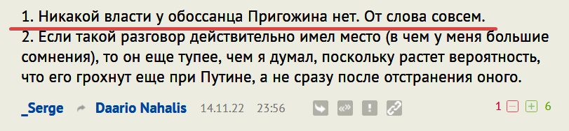 2. Пригожин долго и упорно всеми силами добивается отставки непопулярного Беглова (у которого аппаратного веса чуть больше, чем нисколько), который ему в ответ на это не выдает разрешения на ввод в эксплуатацию зданий, отнимает участки под застройки... И как смог Пригожин, снять Беглова? Ответ - нет не смог. Вот тебе и реальная власть, блин.