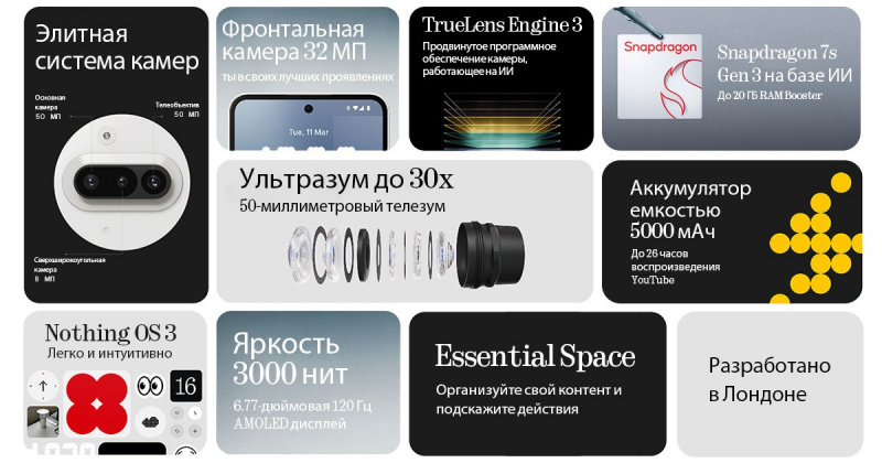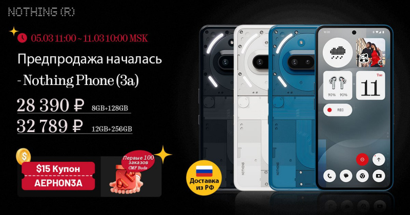 Предпродажа нового смартфона Nothing Phone (3a) началась и будет проходить в следующий период: 05.03.2025 11:00:00 ~ 11.03.2025 09:59:59 (MCK). Первые 100 покупателей получат в подарок наушники CMF Buds.